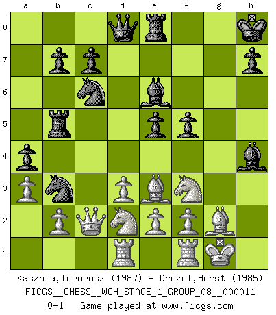 Last move : 0-1 2013 February 8 13:32:47 [Event "FICGS__CHESS__WCH_STAGE_1_GROUP_08__000011"] [Site "FICGS"] [Date "2012.11.01"] [Round "1"] [White "Kasznia,Ireneusz"] [Black "Drozel,Horst"] [Result "0-1"] [WhiteElo "1987"] [BlackElo "1985"] 1.c4 e5 2.Nc3 Nf6 3.Nf3 Nc6 4.g3 d5 5.cxd5 Nxd5 6.Bg2 Nb6 7.O-O Be7 8.d3 O-O 9.Be3 Be6 10.Rc1 Re8 11.Ne4 a5 12.a3 a4 13.Qc2 Bb3 14.Qd2 Nd7 15.Bh3 g6 16.Qc3 f5 17.Ned2 Be6 18.Bh6 Ra5 19.Qc2 Nc5 20.Bg2 g5 21.Qc3 Rb5 22.h4 gxh4 23.gxh4 Bf6 24.Qc2 Bxh4 25.Rcd1 Kh8 26.Be3 Nb3 0-1 English Opening Kingside Castling by player White (move 7) Kingside Castling by player Black (move 8) Player Black won this chess game. Follow this game move after move (download)Personally, I rather look forward to a computer program winning the world Chess Championship. Humanity needs a lesson in humility. (Richard Dawkings) Jeder weiß, dass Gasprom Putins persönliches Machtinstrument ist. Die Firma wird vom Kreml aus geleitet und wird schon deshalb nie transparent sein. (Garry Kasparov) Los finales de Peón son del Ajedrez lo que el cesped es del Golf. (Cecil Purdy) Les Echecs ont trois composantes : le temps, l'espace et le matériel en dernier. (Mikhail Tal) We cannot be sure of having something to live for unless we are willing to die for it. (Ernesto Che Guevara)