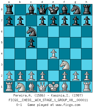 Last move : 0-1 2012 December 28 23:15:0 [Event "FICGS__CHESS__WCH_STAGE_1_GROUP_08__000011"] [Site "FICGS"] [Date "2012.11.01"] [Round "1"] [White "Pereira,Antonio"] [Black "Kasznia,Ireneusz"] [Result "0-1"] [WhiteElo "1586"] [BlackElo "1987"] 1.e4 c5 2.Nf3 Nc6 0-1 This chess game has been lost on time (started : 2012.11.01 17:20:6) Sicilian defense Player Black won this chess game. Follow this game move after move (download)Chess, like love, is infectious at any age. (Flohr) Ja, jede Frau in Holland liebt mich bestimmt, und alle Männer hassen mich. (Loek van Wely) Aunque la mayoría de la gente disfruta observar las partidas de los grandes Maestros de ataque, algunos de los jugadores mas notables en la historia han sido los jugadores silenciosos posicionales. Lentamente ellos te aplastan despojandote de tu espacio, congestionando tus piezas y dejandote virtualmente sin nada que hacer. (Yasser Seirawan) Vouloir jouer aux échecs contre soi-même est aussi paradoxal que vouloir marcher sur son ombre. (Stefan Zweig) Coffee just isn't my cup of tea. (Unknown)
