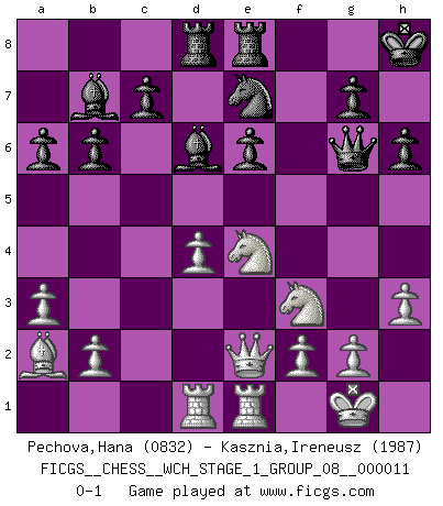 Last move : 0-1 2013 February 17 15:42:37 [Event "FICGS__CHESS__WCH_STAGE_1_GROUP_08__000011"] [Site "FICGS"] [Date "2012.11.01"] [Round "1"] [White "Pechova,Hana"] [Black "Kasznia,Ireneusz"] [Result "0-1"] [WhiteElo "0832"] [BlackElo "1987"] 1.d4 Nf6 2.c4 e6 3.Nc3 d5 4.Nf3 Be7 5.Bf4 O-O 6.e3 Nc6 7.h3 b6 8.a3 dxc4 9.Bxc4 Bd6 10.Bg5 h6 11.Bxf6 Qxf6 12.O-O Qg6 13.Bd3 f5 14.Re1 Bb7 15.e4 Rad8 16.Qe2 Rfe8 17.Rad1 Kh8 18.Bb1 a6 19.Ba2 fxe4 20.Nxe4 Ne7 0-1 This chess game has been lost on time (started : 2012.11.01 17:20:6) Queen's pawn game Kingside Castling by player Black (move 5) Kingside Castling by player White (move 12) Player Black won this chess game. Follow this game move after move (download)Chess is as much a mystery as women. (Purdy) Modernes Schach erfordert enorme Anspannung. Es ist für einen normalen Menschen unmöglich das auszuhalten. (Viktor Kortschnoi) No volvere nunca a jugar contigo. Has insultado a mi amigo. - cuando un oponente se maldijo por una mala jugada (Miguel Najdorf) Toute estimation doit être constamment réévaluée. (Jacob Estrin) If things go wrong, don't go with them. (Roger Babson)
