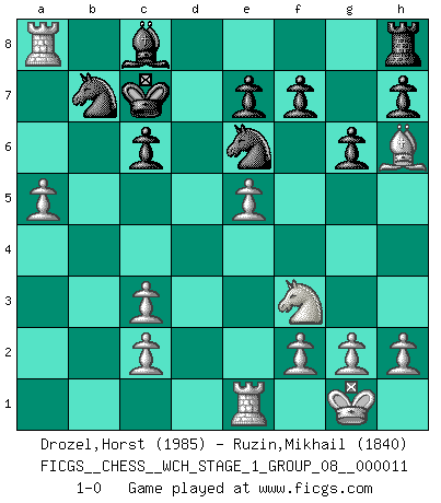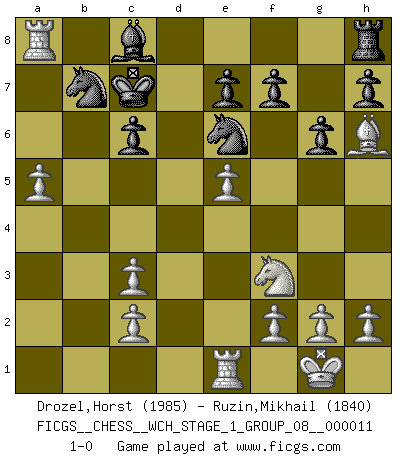 Last move : 1-0 2013 January 9 16:46:8 [Event "FICGS__CHESS__WCH_STAGE_1_GROUP_08__000011"] [Site "FICGS"] [Date "2012.11.01"] [Round "1"] [White "Drozel,Horst"] [Black "Ruzin,Mikhail"] [Result "1-0"] [WhiteElo "1985"] [BlackElo "1840"] 1.e4 g6 2.d4 Bg7 3.Nc3 c5 4.dxc5 Bxc3+ 5.bxc3 Nf6 6.e5 Ne4 7.Bc4 Nxc5 8.Nf3 Nc6 9.O-O Qc7 10.Re1 b5 11.Bxb5 Rb8 12.a4 a6 13.Bf1 Na5 14.Qd6 Ne6 15.Qxc7 Nxc7 16.Bh6 Rb6 17.Rab1 Rc6 18.Rb8 Ne6 19.Bxa6 Kd8 20.Bb5 Kc7 21.Ra8 Nb7 22.Bxc6 dxc6 23.a5 1-0 Robatsch defense Kingside Castling by player White (move 9) Player White won this chess game. Follow this game move after move (download)There are two classes of men; those who are content to yield to circumstances and who play whist; those who aim to control circumstances, and who play Chess. (Mortimer Collins) Fischer machte Schach einfach zu einer aufregenden Sache, wann immer er sich ans Brett setzte. (Raymond Keene) Una de estas pequeñas movidas modestas pudieran ser mas molestas a tu oponente que la amenaza mas grande. (Siegbert Tarrasch) Ce n'est pas pour s'amuser qu'il joue aux échecs : il célèbre un culte. (Vladimir Nabokov) The Movers & Shakers of this world are those who play chess in the mornings and go to the disco in the evenings. (Dinesh De Silva)