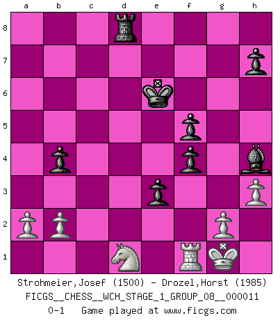 Last move : 0-1 2013 March 21 16:57:29 [Event "FICGS__CHESS__WCH_STAGE_1_GROUP_08__000011"] [Site "FICGS"] [Date "2012.11.01"] [Round "1"] [White "Strohmeier,Josef"] [Black "Drozel,Horst"] [Result "0-1"] [WhiteElo "1500"] [BlackElo "1985"] 1.e4 c5 2.Nf3 d6 3.Bb5+ Nd7 4.O-O a6 5.Bxd7+ Bxd7 6.d4 cxd4 7.Nxd4 Nf6 8.f3 e5 9.Nb3 Be7 10.Nc3 Be6 11.Nd5 Bxd5 12.exd5 Qb6+ 13.Kh1 Qb5 14.Bg5 Qxd5 15.Bxf6 Qxd1 16.Raxd1 gxf6 17.Na5 b5 18.c3 Rc8 19.Rd5 Kd7 20.Rfd1 Ke6 21.R5d3 f5 22.Nb3 f4 23.Nd2 a5 24.Ne4 Rhd8 25.Kg1 f5 26.Nf2 b4 27.cxb4 axb4 28.h3 d5 29.R3d2 e4 30.fxe4 dxe4 31.Rxd8 Bxd8 32.Re1 Bh4 33.Rf1 Rd8 34.Nd1 e3 0-1 Sicilian : Canal-Sokolsky (Nimzovich-Rossolimo, Moscow) attack Kingside Castling by player White (move 4) Player Black won this chess game. Follow this game move after move (download)Openings teach you openings. Endgames teach you chess ! (Stephan Gerzadowicz) Ein Teil des Fehlers ist immer korrekt. (Savielly Grigorievitsch Tartakower) Dejen al perfeccionista jugar por correo. (Yasser Seirawan) Shah mat. Le roi est mort. Cri de fierté d'un joueur venant de terrasser son adversaire, courtoisement, sans effusion de sang. The only thing that overcomes hard luck is hard work. (Harry Golden)
