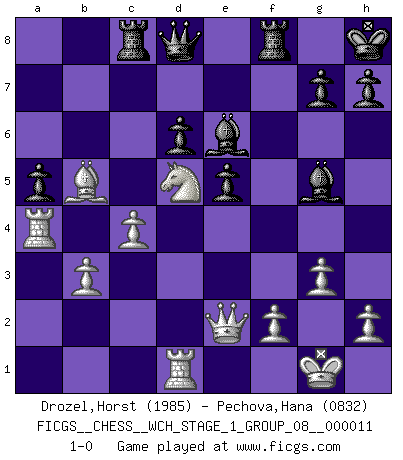 Last move : 1-0 2013 April 27 9:49:35 [Event "FICGS__CHESS__WCH_STAGE_1_GROUP_08__000011"] [Site "FICGS"] [Date "2012.11.01"] [Round "1"] [White "Drozel,Horst"] [Black "Pechova,Hana"] [Result "1-0"] [WhiteElo "1985"] [BlackElo "0832"] 1.e4 c5 2.Nf3 Nc6 3.d4 cxd4 4.Nxd4 Nf6 5.Nc3 e5 6.Ndb5 d6 7.Bg5 a6 8.Na3 b5 9.Nd5 Be7 10.Bxf6 Bxf6 11.c3 O-O 12.Nc2 Bg5 13.a4 bxa4 14.Rxa4 a5 15.Bc4 Rb8 16.b3 Kh8 17.Nce3 Ne7 18.Nxe7 Qxe7 19.Nd5 Qd8 20.O-O f5 21.exf5 Bxf5 22.Qe2 Be6 23.Rd1 Rc8 24.g3 Bd7 25.Bb5 Be6 26.c4 1-0 Sicilian : Pelikan (Lasker/Sveshnikov) variation Kingside Castling by player Black (move 11) Kingside Castling by player White (move 20) Player White won this chess game. Follow this game move after move (download)The hallmark of the artist is simplicity. (Larry Evans) Dieses schreckliche Gefühl, dass ich gegen eine Maschine spielte, die niemals Fehler macht, zerschmetterte meinen Widerstand. (Mark Taimanov) Me gusta decir que Bobby Fischer fue el mejor jugador que jamás haya existido. Pero lo que hizo de Fischer un genio, fue su habilidad de mezclar una frescura y pragmatismo Americano con ideas Rusas acerca de la estrategia. (Bruce Pandolfini) La vie est comme un jeu d'échecs : nous esquissons un plan, mais celui-ci est tributaire de ce que daignent faire l'adversaire aux échecs et le destin dans la vie. (Arthur Schopenhauer) I don't know, I don't care, and it doesn't make any difference. (Albert Einstein)