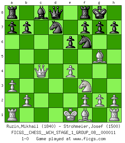 Last move : 1-0 2012 December 21 9:15:21 [Event "FICGS__CHESS__WCH_STAGE_1_GROUP_08__000011"] [Site "FICGS"] [Date "2012.11.01"] [Round "1"] [White "Ruzin,Mikhail"] [Black "Strohmeier,Josef"] [Result "1-0"] [WhiteElo "1840"] [BlackElo "1500"] 1.d4 Nf6 2.c4 e6 3.Nc3 Bb4 4.Qc2 c5 5.a3 Bxc3+ 6.Qxc3 cxd4 7.Qxd4 d5 8.Bg5 dxc4 9.Qxc4 O-O 10.Nf3 Nbd7 11.e4 1-0 Nimzo-Indian : Classical, 4...c5 Kingside Castling by player Black (move 9) Player White won this chess game. Follow this game move after move (download)When you are lonely, when you feel yourself an alien in the world, play Chess. This will raise your spirits and be your counselor in war. (Aristotle) Alles was am Schachbrett zählt sind gute Züge. (Robert James Fischer) Aquel que teme a un Peón de Reina aislado, debería de retirarse del Ajedrez. (Siegbert Tarrasch) Mais n'est-ce pas déjà le limiter injurieusement que d'appeler les échecs un jeu? N'est-ce pas aussi une science, un art, ou quelque chose qui, comme le cercueil de Mahomet entre ciel et terre, est suspendu entre l'un et l'autre, et qui réunit un nombre incroyable de contraires ? (Stefan Zweig) Computers are like Old Testament gods; lots of rules and no mercy. (Joseph Campbell)