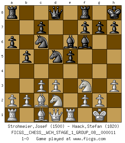 Last move : 1-0 2013 February 5 13:50:20 [Event "FICGS__CHESS__WCH_STAGE_1_GROUP_08__000011"] [Site "FICGS"] [Date "2012.11.01"] [Round "1"] [White "Strohmeier,Josef"] [Black "Haack,Stefan"] [Result "1-0"] [WhiteElo "1500"] [BlackElo "1820"] 1.e4 e5 2.Nf3 Nc6 3.Bb5 a6 4.Ba4 Nf6 5.O-O b5 6.Bb3 Be7 7.d3 O-O 8.c3 d5 9.exd5 Nxd5 10.Re1 Bf6 11.h3 Be6 12.Bc2 Kh8 13.Nbd2 1-0 This chess game has been lost on time (started : 2012.11.01 17:20:6) Ruy Lopez : 5.O-O Kingside Castling by player White (move 5) Kingside Castling by player Black (move 7) Player White won this chess game. Follow this game move after move (download)I prefer to lose a really good game than to win a bad one. (David Levy) Die Fehler sind da, Sie warten nur darauf gemacht zu werden. (Savielly Grigorievitsch Tartakower) Peones: ellos son el alma de esta partida, solos forman el ataque y la defensa. (Philidor) Les ravages du H expliquent la différence de niveau entre Tal et Thal [Abergel]. A married woman is like a fish riding a bicycle. (Rodolfo d'Ettorre)