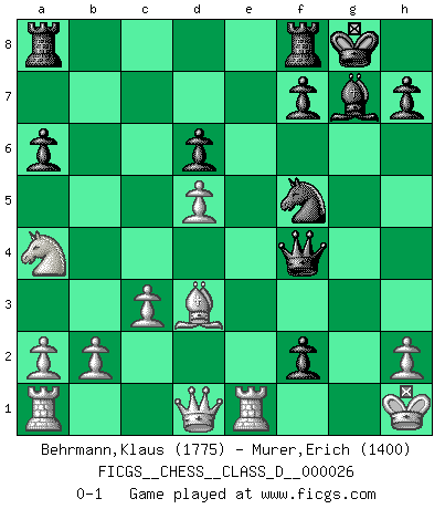 Last move : 0-1 2007 March 4 13:27:11 [Event "FICGS__CHESS__CLASS_D__000026"] [Site "FICGS"] [Date "2007.01.17"] [Round "1"] [White "Behrmann,Klaus"] [Black "Murer,Erich"] [Result "0-1"] [WhiteElo "1775"] [BlackElo "1400"] 1.e4 c5 2.Nf3 Nc6 3.d4 cxd4 4.Nxd4 Nf6 5.Nc3 e5 6.Ndb5 d6 7.Bg5 a6 8.Na3 b5 9.Bxf6 gxf6 10.Nd5 f5 11.Bd3 Be6 12.O-O Bxd5 13.exd5 Ne7 14.Nxb5 Bg7 15.Nc3 e4 16.Bc4 Ng6 17.Na4 Qg5 18.Re1 Nh4 19.g3 O-O 20.Be2 f4 21.Kh1 Nf5 22.c3 e3 23.gxf4 Qxf4 24.Bd3 exf2 0-1 Sicilian : Pelikan (Lasker/Sveshnikov) variation Kingside Castling by player White (move 12) Kingside Castling by player Black (move 19) Player Black won this chess game. Follow this game move after move (download)Human affairs are like a Chess game: only those who do not take it seriously can be called good players. (Hung Tzu Ch'eng) Matt entspricht nicht immer den Tatsachen. (Savielly Grigorievitsch Tartakower) Una victoria por una combinación errónea, aunque sea espectacular, me llena de horror artístico. (Wilhelm Steinitz) La tactique est l'élément le plus important du milieu de jeu. (Siegbert Tarrasch) The best weapon against an enemy is another enemy. (Friedrich Nietzsche)
