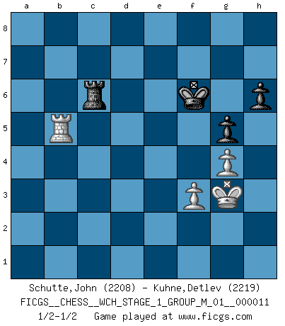 Last move : 1/2-1/2 2013 April 1 20:16:54 [Event "FICGS__CHESS__WCH_STAGE_1_GROUP_M_01__000011"] [Site "FICGS"] [Date "2012.11.01"] [Round "1"] [White "Schutte,John"] [Black "Kuhne,Detlev"] [Result "1/2-1/2"] [WhiteElo "2208"] [BlackElo "2219"] 1.e4 c5 2.Nf3 d6 3.d4 cxd4 4.Nxd4 Nf6 5.Nc3 a6 6.Bg5 e6 7.Qf3 h6 8.Be3 e5 9.Nb3 Be7 10.h3 b5 11.Bd3 O-O 12.O-O Bb7 13.a4 b4 14.Ne2 d5 15.Ng3 Qc7 16.Rac1 Rd8 17.a5 dxe4 18.Nxe4 Nbd7 19.c3 Bd5 20.c4 Bc6 21.Rfe1 Kh8 22.Bb1 Rac8 23.Red1 Ba8 24.h4 Bc6 25.h5 Kg8 26.Nxf6+ Nxf6 27.Rxd8+ Bxd8 28.Qh3 e4 29.Bf4 Qd7 30.Qxd7 Bxd7 31.Bd6 Be6 32.Nc5 Bxa5 33.Nxe6 fxe6 34.Kf1 Kf7 35.Ke2 Rc6 36.c5 Bc7 37.Bxc7 Rxc7 38.Ke3 Nxh5 39.Bxe4 Nf6 40.Bf3 e5 41.Kd3 Nd7 42.c6 Nf6 43.Rc4 b3 44.Rc3 Ke6 45.Rxb3 e4+ 46.Bxe4 Nxe4 47.Kxe4 Rxc6 48.Rb7 Kf6 49.g4 Rc4+ 50.Kf3 Rc6 51.Kg3 g5 52.f3 Ke5 53.b4 Ke6 54.b5 axb5 55.Rxb5 Kf6 1/2-1/2 Sicilian : Najdorf, 6...e6 Kingside Castling by player Black (move 11) Kingside Castling by player White (move 12) 10 pieces endgame at move 47 : White KRPPP , Black KRPPP WHITE : King + 1 Rook 3 Pawns BLACK : King + 1 Rook 3 Pawns 9 pieces endgame at move 54 : White KRPP , Black KRPPP WHITE : King + 1 Rook 2 Pawns BLACK : King + 1 Rook 3 Pawns 8 pieces endgame at move 55 : White KRPP , Black KRPP WHITE : King + 1 Rook 2 Pawns BLACK : King + 1 Rook 2 Pawns This chess game ended in a draw. Follow this game move after move (download)Chess is a part of culture and if a culture is declining then Chess too will decline. (Mikhail Botvinnik) Wenn Du nicht kämpfst, um anderen etwas zu beweisen, sondern nur für Dich selbst, dann bist du fast unbesiegbar. (Garry Kasparov) Para mi, el Ajedrez es la vida y cada partida es como una nueva vida. Todo jugador de Ajedrez suele vivir muchas vidas durante su vida. (Eduard Gufeld) Avec des compensations pour le matériel en plus... (Anonyme) Players are not good because they find tactics, it is about the way to find the positions in which those tactics are hidden. (Luc-Olivier Leclerc)