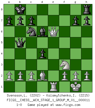 Last move : 1-0 2013 February 18 15:43:47 [Event "FICGS__CHESS__WCH_STAGE_1_GROUP_M_01__000011"] [Site "FICGS"] [Date "2012.11.01"] [Round "1"] [White "Svensson,Leif"] [Black "Kolomytchenko,Igor"] [Result "1-0"] [WhiteElo "2202"] [BlackElo "2215"] 1.e4 e5 2.Nf3 Nc6 3.d4 exd4 4.Bc4 Nf6 5.O-O Nxe4 6.Re1 d5 7.Bxd5 Qxd5 8.Nc3 Qa5 9.Nxe4 Be6 10.Neg5 O-O-O 11.Nxe6 fxe6 12.Rxe6 Bd6 13.Bg5 Rde8 14.Qe2 Rxe6 15.Qxe6+ Kb8 16.Bd2 Qb5 17.Re1 1-0 This chess game has been lost on time (started : 2012.11.01 17:24:31) Scotch gambit : Dubois-Reti defense Kingside Castling by player White (move 5) Queenside Castling by player Black (move 10) Player White won this chess game. Follow this game move after move (download)Chess, like any creative activity, can exist only through the combined efforts of those who have creative talent, and those who have the ability to organize their creative work. (Mikhail Botvinnik) Sitze auf Deine Hände. (Siegbert Tarrasch) La captura del Rey enemigo es la finalidad pero no el primer objetivo de la partida. (William Steinitz) Karpov est une pièce de musée. (Garry Kasparov) Life is pleasant. Death is peaceful. It's the transition that's troublesome. (Isaac Asimov)