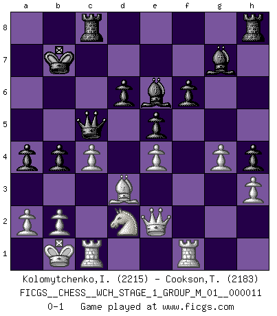 Last move : 0-1 2013 February 19 3:57:21 [Event "FICGS__CHESS__WCH_STAGE_1_GROUP_M_01__000011"] [Site "FICGS"] [Date "2012.11.01"] [Round "1"] [White "Kolomytchenko,Igor"] [Black "Cookson,Timothy"] [Result "0-1"] [WhiteElo "2215"] [BlackElo "2183"] 1.e4 c5 2.Nf3 d6 3.d4 cxd4 4.Nxd4 Nf6 5.Nc3 Nc6 6.Bg5 e6 7.Qd2 a6 8.O-O-O Bd7 9.f4 h6 10.Bh4 b5 11.Bxf6 gxf6 12.Kb1 Qb6 13.Nxc6 Bxc6 14.f5 h5 15.fxe6 fxe6 16.Qf4 Be7 17.Bd3 Qc5 18.Ne2 O-O-O 19.c3 e5 20.Qf3 h4 21.c4 b4 22.g4 a5 23.h3 Kb7 24.Rhf1 a4 25.Ng1 Bd7 26.Qe2 Be6 27.Nf3 Rc8 28.Rc1 Bf8 29.Nd2 Bg7 0-1 This chess game has been lost on time (started : 2012.11.01 17:24:31) Sicilian : Richter-Rauzer, Rauzer attack, 7...a6 Queenside Castling by player White (move 8) Queenside Castling by player Black (move 18) Player Black won this chess game. Follow this game move after move (download)Chess is a foolish expedient for making idle people believe they are doing something very clever when they are only wasting their time. (George Bernard Shaw) Auf Remis zu spielen ist gewissermaßen ein Verbrechen gegen das Schachspiel. (Mikhail Nekhemyevich Tal) a manera como él juega al Ajedrez, demuestra la completa naturaleza de un hombre. (Stanley Ellin) La vie et les Echecs sont tous les deux une lutte constante. (Lasker) Information on the Internet is subject to the same rules and regulations as conversation at a bar. (George Lundberg)