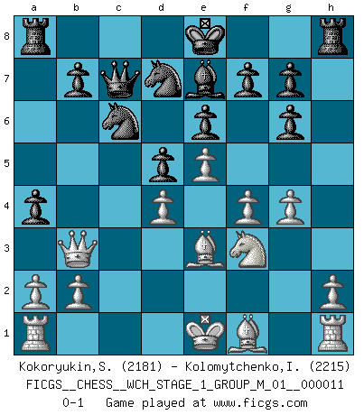 Last move : 0-1 2013 March 2 4:34:38 [Event "FICGS__CHESS__WCH_STAGE_1_GROUP_M_01__000011"] [Site "FICGS"] [Date "2012.11.01"] [Round "1"] [White "Kokoryukin,Sergey"] [Black "Kolomytchenko,Igor"] [Result "0-1"] [WhiteElo "2181"] [BlackElo "2215"] 1.d4 d5 2.c4 c6 3.Nf3 Nf6 4.Nbd2 Bf5 5.Nh4 Be4 6.f3 Bg6 7.Qb3 Qc7 8.g4 e6 9.e4 Be7 10.cxd5 cxd5 11.Nxg6 hxg6 12.e5 Nfd7 13.f4 Nc6 14.Nf3 a5 15.Be3 a4 0-1 This chess game has been lost on time (started : 2012.11.01 17:24:31) QGD Slav : Breyer variation Player Black won this chess game. Follow this game move after move (download)A thorough understanding of the typical mating continuations makes the most complicated sacrificial combinations leading up to them not only not difficult, but almost a matter of course. (Siegbert Tarrasch) Es ist besser die Steine des Gegners zu opfern. (Savielly Grigorievitsch Tartakower) Aún el Rey más flojo huye despavorido ante la amenaza de un Jaque doble. (Aaron Nimzowitsch) Donnez-moi un Cavalier en 6e et je gagnerais toutes mes parties. (Steinitz) Any activity becomes creative when the doer cares about doing it right or doing it better. (John Updike)
