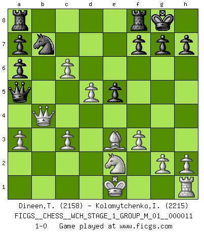 Last move : 1-0 2013 February 6 1:50:22 [Event "FICGS__CHESS__WCH_STAGE_1_GROUP_M_01__000011"] [Site "FICGS"] [Date "2012.11.01"] [Round "1"] [White "Dineen,Thomas"] [Black "Kolomytchenko,Igor"] [Result "1-0"] [WhiteElo "2158"] [BlackElo "2215"] 1.d4 Nf6 2.c4 e6 3.Nc3 Bb4 4.f3 d5 5.a3 Bxc3+ 6.bxc3 c5 7.cxd5 Nxd5 8.dxc5 Qa5 9.e4 Ne7 10.Be3 O-O 11.Qb3 Qc7 12.Bb5 Nec6 13.Ne2 Na5 14.Qb4 e5 15.Rd1 Na6 16.Bxa6 bxa6 17.Qa4 Be6 18.Rd5 Bxd5 19.exd5 Nb7 20.c6 Qa5 21.Qb4 1-0 This chess game has been lost on time (started : 2012.11.01 17:24:31) Nimzo-Indian : Kmoch variation Kingside Castling by player Black (move 10) Player White won this chess game. Follow this game move after move (download)It is the aim of the modern school, not to treat every position according to one general law, but according to the principle inherent in the position. (Richard Reti) Im Leben werden Partien nie so unstrittig gewonnen wie im Spiel (Emanuel Lasker) De todos mis libros Rusos, la defensa contiene y difunde el 'calor' mas grande que pudiese verse extraño al observar lo supremamente abstracto que el Ajedrez supuestamente es. (Vladimir Nabokov) L'ordinateur a tué l'originalité. Il n'y a plus guère d'aventures sur l'échiquier. (Jacob Murray) In every real man a child is hidden that wants to play. (Friedrich Nietzsche)