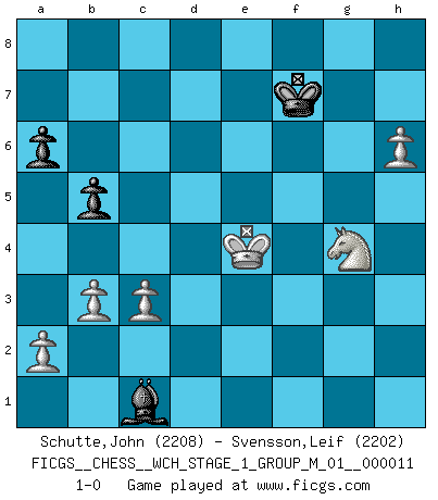 Last move : 1-0 2013 June 6 15:30:8 [Event "FICGS__CHESS__WCH_STAGE_1_GROUP_M_01__000011"] [Site "FICGS"] [Date "2012.11.01"] [Round "1"] [White "Schutte,John"] [Black "Svensson,Leif"] [Result "1-0"] [WhiteElo "2208"] [BlackElo "2202"] 1.e4 c5 2.Nf3 e6 3.d4 cxd4 4.Nxd4 Nc6 5.Nc3 Qc7 6.Be3 a6 7.Qd2 Nf6 8.O-O-O Bb4 9.f3 Ne5 10.Nb3 b5 11.Qe1 Be7 12.f4 Ng6 13.e5 Ng4 14.Ne4 Nxe3 15.Qxe3 O-O 16.h4 f6 17.exf6 gxf6 18.g3 Bb7 19.h5 Nh8 20.Rg1 Nf7 21.Kb1 Rac8 22.Bd3 d5 23.Nf2 e5 24.Bf5 Rce8 25.Rgf1 Kh8 26.Nd3 e4 27.Ndc5 Nd6 28.Bg6 Rc8 29.Qc1 Qb6 30.Nd7 Qd8 31.Nxf8 Bxf8 32.g4 Qb6 33.Bf5 Re8 34.h6 Nc4 35.Rg1 Be7 36.g5 fxg5 37.fxg5 Ne3 38.Nd4 Nxd1 39.Qxd1 Bc8 40.Bxc8 Rxc8 41.Nf5 Bf8 42.Rf1 Qc5 43.c3 Qc4 44.Ne3 Qd3+ 45.Qxd3 exd3 46.Nxd5 Bd6 47.Rf7 Rf8 48.Rxf8+ Bxf8 49.Kc1 Bd6 50.Kd2 Kg8 51.Nf6+ Kf7 52.Nxh7 Kg6 53.Nf6 Bf4+ 54.Kxd3 Bxg5 55.Ng4 Kf7 56.b3 Bc1 57.Ke4 1-0 Sicilian : Taimanov variation Queenside Castling by player White (move 8) Kingside Castling by player Black (move 15) 10 pieces endgame at move 54 : White KNPPPP , Black KBPP WHITE : King + 1 Knight 4 Pawns BLACK : King + 1 Bishop 2 Pawns Player White won this chess game. Follow this game move after move (download)Any material change in a position must come about by mate, a capture, or a Pawn promotion. (Purdy) Ich spiele 70 Eröffnungssysteme. (Viktor Kortschnoi) ¿Esta Bobby Fischer algo cuerdo?. (Salo Flohr) Dans le domaine de la peinture, de la gravure et de la sculpture, dès la première décennie de notre siècle, les artistes abandonnent la représentation de la partie d'échecs pour se concentrer sur les pièces, sur les échiquiers et sur toutes les variations auxquelles les unes et les autres peuvent donner lieu. On passe en quelque sorte d'un thème social à un thème musical (au sens de la musica médiévale, c'est-à-dire d'une notion qui inclue le rythme, l'harmonie, la construction et la déconstruction, etc.). Graphiquement et picturalement, l'échiquier apparaît comme une structure ouverte, dynamique, d'une richesse infinie, autorisant toutes les combinatoires et débouchant sur des mouvements et des rythmes de nature exponentielle. (Michel Pastoureau) Macintosh - we might not get everything right, but at least we knew the century was going to end. (Douglas Adams)