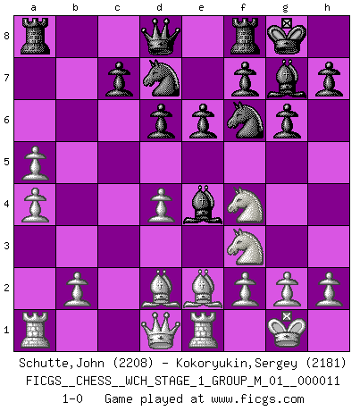 Last move : 1-0 2013 February 22 16:1:49 [Event "FICGS__CHESS__WCH_STAGE_1_GROUP_M_01__000011"] [Site "FICGS"] [Date "2012.11.01"] [Round "1"] [White "Schutte,John"] [Black "Kokoryukin,Sergey"] [Result "1-0"] [WhiteElo "2208"] [BlackElo "2181"] 1.e4 g6 2.d4 Bg7 3.Nc3 a6 4.Nf3 d6 5.Be2 b5 6.a4 b4 7.Nd5 a5 8.O-O Bb7 9.Re1 Nd7 10.c3 e6 11.Nf4 Ngf6 12.cxb4 O-O 13.bxa5 Bxe4 14.Bd2 1-0 This chess game has been lost on time (started : 2012.11.01 17:24:31) Robatsch defense Kingside Castling by player White (move 8) Kingside Castling by player Black (move 12) Player White won this chess game. Follow this game move after move (download)I have never in my life played the French Defence, which is the dullest of all openings. (Wilhelm Steinitz) Jeder leidlich begabte Spieler, er braucht keineswegs hervorragend veranlagt zu sein, kann es zum Meister bringen. Aber das ist ja auch gar nicht nötig! Der richtige Standpunkt ist es, zu seinem Vergnügen zu spielen, und man glaube ja nicht, dass der Genuss proportional dem Können sei. (Siegbert Tarrasch) Coloca el contenido de las piezas del Ajedrez en un sombrero, agitalo vigorosamente, arrojalas en un tablero desde una altura de 30 centimetros y así obtendras el estilo de Steinitz. (H. E. Bird) Les échecs, c'est l'imagination. (David Bronstein) Don't be irreplaceable, if you can't be replaced, you can't be promoted. (Dan Rotaru)