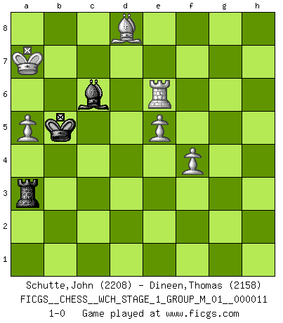 Last move : 1-0 2013 May 22 17:35:38 [Event "FICGS__CHESS__WCH_STAGE_1_GROUP_M_01__000011"] [Site "FICGS"] [Date "2012.11.01"] [Round "1"] [White "Schutte,John"] [Black "Dineen,Thomas"] [Result "1-0"] [WhiteElo "2208"] [BlackElo "2158"] 1.e4 e6 2.d4 d5 3.Nc3 Nf6 4.e5 Nfd7 5.f4 c5 6.Nf3 Nc6 7.Be3 cxd4 8.Nxd4 Qb6 9.Qd2 Qxb2 10.Rb1 Qa3 11.Bb5 Nxd4 12.Bxd4 a6 13.Bxd7+ Bxd7 14.Rb3 Qe7 15.Rxb7 Qh4+ 16.Bf2 Qd8 17.Bb6 Qc8 18.Rc7 Qd8 19.Qd4 Rc8 20.Rc6 Qe7 21.Rxc8+ Bxc8 22.O-O Qb4 23.Rb1 Qxd4+ 24.Bxd4 Kd8 25.Na4 Kc7 26.Bb6+ Kb8 27.Kf2 Bd7 28.Nc5 Bxc5+ 29.Bxc5 Ka8 30.Rb6 Bb5 31.a4 Bc4 32.Bd4 Rb8 33.Rd6 h5 34.h3 Rb1 35.Kg3 Bf1 36.Kh4 Bxg2 37.Rxa6+ Kb8 38.a5 Rb5 39.c3 g6 40.Bb6 Rb3 41.Ra7 Rxc3 42.Rxf7 Rc6 43.Rg7 Be4 44.Kg5 Bg2 45.Kxg6 h4 46.Kg5 Bxh3 47.Kxh4 Bf5 48.Kg5 d4 49.Ba7+ Kc8 50.Bxd4 Rc7 51.Rg8+ Kb7 52.Rd8 Rc4 53.Rd6 Rc6 54.Kf6 Bh3 55.Bf2 Bf5 56.Bh4 Ra6 57.Kf7 Rc6 58.Bd8 Bg4 59.Ke8 Bh3 60.Rd7+ Ka6 61.Rd4 Kb5 62.Kd7 Rc3 63.Rd6 Ra3 64.Kc8 Rc3+ 65.Kb8 Ra3 66.Kb7 Bg2+ 67.Ka7 Bc6 68.Rxe6 1-0 French : Steinitz, Boleslavsky variation Kingside Castling by player White (move 22) 10 pieces endgame at move 50 : White KRBPPP , Black KRBP WHITE : King + 1 Rook 1 Bishop 3 Pawns BLACK : King + 1 Rook 1 Bishop 1 Pawn 9 pieces endgame at move 68 : White KRBPPP , Black KRB WHITE : King + 1 Rook 1 Bishop 3 Pawns BLACK : King + 1 Rook 1 Bishop Player White won this chess game. Follow this game move after move (download)First-class players lose to second-class players because second-class players sometimes play a first-class game. (Siegbert Tarrasch) Schach sollte überall auf der Welt Schulfach werden. Es fördert die geistige Auseinandersetzung. Es lehrt die Demut in der Niederlage. (Garry Kasparov) Hay dos clases de hombres: aquellos que se conforman en dejarse llevar por las circunstancias y que juegan barajas y aquellos decididos a controlar las circunstancias y que juegan al Ajedrez. (Mortimer Collins) Les Echecs ne sont pas pour les âmes timides. Ils requièrent un homme entier, qui ne s'arrête pas aveuglément à ce qui a été déjà établi, mais qui tente individuellement de sonder les profondeurs du jeu. (W. Steinitz) Horse racing is animated roulette. (Roger Kahn)