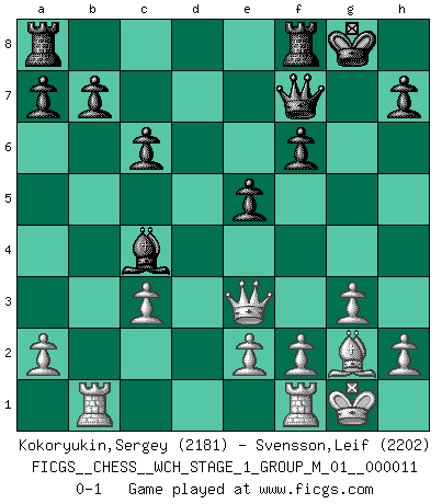Last move : 0-1 2013 March 19 6:24:58 [Event "FICGS__CHESS__WCH_STAGE_1_GROUP_M_01__000011"] [Site "FICGS"] [Date "2012.11.01"] [Round "1"] [White "Kokoryukin,Sergey"] [Black "Svensson,Leif"] [Result "0-1"] [WhiteElo "2181"] [BlackElo "2202"] 1.d4 Nf6 2.c4 e5 3.dxe5 Ng4 4.Bf4 Nc6 5.Nf3 Bb4+ 6.Nc3 Bxc3+ 7.bxc3 Qe7 8.Qd5 f6 9.exf6 Nxf6 10.Qd3 d6 11.g3 Ne5 12.Nxe5 dxe5 13.Bg5 Be6 14.Bg2 c6 15.O-O O-O 16.Rab1 Qf7 17.Bxf6 Bxc4 18.Qe3 gxf6 0-1 Budapest : Rubinstein variation Kingside Castling by player White (move 15) Kingside Castling by player Black (move 15) Player Black won this chess game. Follow this game move after move (download)Chess opens and enriches your mind. (Saudin Robovic) Ich hatte Angst gegen einen russischen Großmeister zu verlieren, und er befürchtete gegen einen kleinen Jungen zu verlieren. (über ein Remis gegen Juri Awerbach). (Robert James Fischer) Bobby Fischer es el jugador de Ajedrez mas grande que jamás haya existido. (Ken Smith) Des combinaisons [dans le jeu d'échecs] pareilles à des mélodies. Je crois entendre pour ainsi dire la musique des coups... (Vladimir Nabokov) The arrogant army will lose certainly the battle. (Chinese proverb)