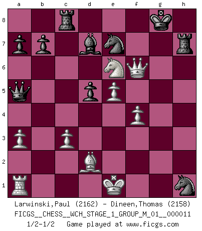 Last move : 1/2-1/2 2013 January 2 16:18:26 [Event "FICGS__CHESS__WCH_STAGE_1_GROUP_M_01__000011"] [Site "FICGS"] [Date "2012.11.01"] [Round "1"] [White "Larwinski,Paul"] [Black "Dineen,Thomas"] [Result "1/2-1/2"] [WhiteElo "2162"] [BlackElo "2158"] 1.e4 e6 2.d4 d5 3.Nc3 Nf6 4.Bg5 Bb4 5.e5 h6 6.Bc1 Ne4 7.Qg4 g6 8.Nge2 c5 9.a3 Bxc3+ 10.bxc3 cxd4 11.cxd4 Qa5+ 12.c3 Nc6 13.Be3 Ne7 14.Qh3 f6 15.f3 Ng5 16.Qg4 fxe5 17.dxe5 Nf7 18.f4 h5 19.Qf3 O-O 20.Qh3 Nh6 21.Bd2 Bd7 22.Nd4 Nhf5 23.Bd3 Rac8 24.g4 hxg4 25.Qxg4 Rf7 26.h4 Rg7 27.h5 gxh5 28.Qxh5 Ng3 29.Bh7+ Kh8 30.Qh6 Nxh1 31.Nxe6 Rxh7 32.Qf6+ Kg8 1/2-1/2 French : MacCutcheon, Dr. Olland (Dutch) variation Kingside Castling by player Black (move 19) This chess game ended in a draw. Follow this game move after move (download)Blessed be the memory of him who gave the world this immortal game. (A. G. Gardiner) Ich bin Weltmeister und muß mit niemandem irgend etwas diskutieren. (Viswanathan Anand) Muchos jugadores de Ajedrez se sorprendían cuando después de la partida, Fischer explicaba con calma: 'Yo ya había analizado esta posibilidad' en una posición en la cual yo creía que no era posible de prever desde la apertura. (Mikhail Tal) RxDa4 pat (...) Yoga is 99% practice and 1% knowledge. (Sri Krishna Pattabhi Jois)