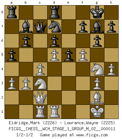Last move : 1/2-1/2 2013 February 3 1:11:39 [Event "FICGS__CHESS__WCH_STAGE_1_GROUP_M_02__000011"] [Site "FICGS"] [Date "2012.11.01"] [Round "1"] [White "Eldridge,Mark"] [Black "Lowrance,Wayne"] [Result "1/2-1/2"] [WhiteElo "2226"] [BlackElo "2225"] 1.d4 Nf6 2.c4 e6 3.Nf3 b6 4.g3 Ba6 5.b3 Bb7 6.Bg2 Bb4+ 7.Bd2 a5 8.O-O O-O 9.a3 Be7 10.Nc3 Ne4 11.Qc2 Nxd2 12.Nxd2 c6 13.e4 d6 14.Rfd1 Nd7 15.Nf1 Qc7 16.Ne3 Rfd8 17.Rac1 Bf8 18.d5 g6 19.h4 Bh6 20.f4 cxd5 21.Ng4 Bg7 22.exd5 e5 23.f5 1/2-1/2 Queen's Indian : Nimzovich variation (exaggerated Fianchetto) Kingside Castling by player White (move 8) Kingside Castling by player Black (move 8) This chess game ended in a draw. Follow this game move after move (download)With or without the title, Bobby Fischer was unquestionably the greatest player of his time. (Burt Hochberg) Im Schach gewinnt jeder. Hat man Freunde am Spiel - und das ist die Hauptsache - ist auch der Verlust einer Partie kein Unglück. (David Bronstein) El Ajedrez demanda una total concentración. (Bobby Fischer) Karpov est une pièce de musée. (Garry Kasparov) Bobby never cared about money, though. His only desire was to prove that his choices were correct: He wanted chess to be important because he was a chess player, and he wanted to be important. Bobby knew money was important, but he didn't have a clue why, outside of clothes and status. The only way he could accomplish what he wanted was to fight for a lot of money. Once he got it, he gave it away. He did not know how to spend it. And once he'd become champion, after, essentially, sacrificing his life for it, he didn't know how to spend his time. (Bob Wade)