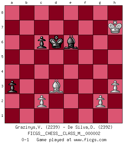 Last move : 0-1 2007 April 21 22:58:23 [Event "FICGS__CHESS__CLASS_M__000002"] [Site "FICGS"] [Date "2006.04.10"] [Round "1"] [White "Grazinys,Vidmantas"] [Black "De Silva,Dinesh"] [Result "0-1"] [WhiteElo "2239"] [BlackElo "2392"] 1.e4 c5 2.Nf3 d6 3.d4 cxd4 4.Nxd4 Nf6 5.Nc3 a6 6.Bg5 e6 7.f4 Qb6 8.Qd2 Qxb2 9.Rb1 Qa3 10.f5 Nc6 11.fxe6 fxe6 12.Nxc6 bxc6 13.e5 dxe5 14.Bxf6 gxf6 15.Ne4 Qxa2 16.Rd1 Be7 17.Nd6+ Bxd6 18.Qxd6 Qa5+ 19.Rd2 Ra7 20.Be2 Rd7 21.Qxe6+ Kd8 22.Qxf6+ Kc7 23.Bd3 Rhd8 24.Qg5 Rf7 25.Ke2 h6 26.Qg3 Rf4 27.h3 Re4+ 28.Kf3 Qxd2 29.Kxe4 Rd4+ 30.Kxe5 Qc3 31.Kf6 Rf4+ 32.Kg6 Qe5 33.Rf1 Rf6+ 34.Rxf6 Qxg3+ 35.Kxh6 a5 36.Rf7+ Kd6 37.Rg7 Qh4+ 38.Kg6 a4 39.Rg8 Qg3+ 40.Kh7 Qxg8+ 41.Kxg8 Be6+ 42.Kh7 a3 0-1 Sicilian : Najdorf, 7...Qb6 10 pieces endgame at move 40 : White KBPPP , Black KQBPP WHITE : King + 1 Bishop 3 Pawns BLACK : King + 1 Queen 1 Bishop 2 Pawns 9 pieces endgame at move 41 : White KBPPP , Black KBPP WHITE : King + 1 Bishop 3 Pawns BLACK : King + 1 Bishop 2 Pawns Player Black won this chess game. Follow this game move after move (download)It is difficult to play against Einstein's theory --on his first loss to Fischer. (Mikhail Tal) Die FIDE ist dabei in die Hände der russischen Mafia zu fallen. (Larry Evans) Los tropiezos estan todos ahí en el tablero, esperando que se cometan. (Savielly Tartakover) Les Echecs, c'est l'art de la guerre sans les charniers, c'est la résurrection des morts tombés au champ d'honneur, l'espoir perpétuel, la suprématie de l'intelligence sur la force, la culture de l'esprit. (F. Szpiner) It's unlucky to be superstitious. (Dave Enteles)