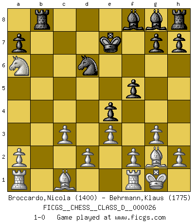 Last move : 1-0 2007 February 22 0:6:44 [Event "FICGS__CHESS__CLASS_D__000026"] [Site "FICGS"] [Date "2007.01.17"] [Round "1"] [White "Broccardo,Nicola"] [Black "Behrmann,Klaus"] [Result "1-0"] [WhiteElo "1400"] [BlackElo "1775"] 1.c4 e5 2.Nc3 Nf6 3.g3 d5 4.cxd5 Nxd5 5.Bg2 Be6 6.Nf3 Nc6 7.O-O f5 8.Qb3 e4 9.Ng5 Bg8 10.Qxb7 Nd4 11.e3 Nxc3 12.bxc3 Rb8 13.Qa6 Nb5 14.Ne6 Qd6 15.Qxd6 Nxd6 16.Nxc7+ Ke7 17.Na6 1-0 English : Bremen, reverse Dragon Kingside Castling by player White (move 7) Player White won this chess game. Follow this game move after move (download)A bad plan is better than none at all. (Frank Marshall) Schach ist Leben. (Robert James Fischer) Un juego de Ajedrez es un dialogo, una conversación entre un jugador y su oponente. Cada movimiento del oponente puede contener amenazas o tropiezos, pero un jugador no se puede defender de las amenazas o tomar ventaja de los tropiezos si es que no se pregunta a sí mismo: ¿Que es lo que mi oponente va a hacer después de cada movida?. (Bruce A. Moon) C'est la seule position que je connaisse où les deux camps sont mals. Propos prêtés à V. Anand. He who laughs last probably does not get the joke. (Unknown)