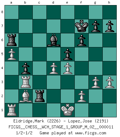Last move : 1/2-1/2 2012 December 15 22:37:16 [Event "FICGS__CHESS__WCH_STAGE_1_GROUP_M_02__000011"] [Site "FICGS"] [Date "2012.11.01"] [Round "1"] [White "Eldridge,Mark"] [Black "Lopez,Jose"] [Result "1/2-1/2"] [WhiteElo "2226"] [BlackElo "2191"] 1.d4 d5 2.c4 e6 3.Nf3 Nf6 4.Nc3 c6 5.e3 Nbd7 6.Qc2 Bd6 7.Bd3 O-O 8.O-O dxc4 9.Bxc4 b5 10.Bd3 Bb7 11.a3 a5 12.Rd1 b4 13.Ne4 Nxe4 14.Bxe4 Nf6 15.Nd2 Qc7 16.h3 Rfc8 17.b3 a4 18.bxa4 c5 19.Bxb7 Qxb7 20.Nc4 Bf8 21.axb4 cxb4 22.Qd3 Ne4 23.Bb2 Qa6 24.Qxe4 Qxc4 25.Qd3 Qxd3 26.Rxd3 Rc2 27.Rb3 f6 28.Kf1 Kf7 29.Ke1 Bd6 30.g3 Ra6 31.a5 e5 32.e4 1/2-1/2 Queen's gambit declined Kingside Castling by player Black (move 7) Kingside Castling by player White (move 8) This chess game ended in a draw. Follow this game move after move (download)Why must I lose to this idiot ? (Aron Nimzovich) Der Freibauer hat für mich eine Seele, genau wie der Mensch, Wünsche, die unerkannt in ihm schlummern, und Befürchtungen, von deren Existenz er selbst kaum ahnt. (Aaron Nimzowitsch) Hay dos clases de hombres: aquellos que se conforman en dejarse llevar por las circunstancias y que juegan barajas y aquellos decididos a controlar las circunstancias y que juegan al Ajedrez. (Mortimer Collins) Un footballeur joue avec ses pieds, parfois avec sa tête. Un joueur d'échecs ne joue qu'avec sa tête. Et quand il ne joue plus, il meurt. (Jacob Murray) Ah, beer! The cause of, and the solution to, all of life's problems. (Homer Simpson)