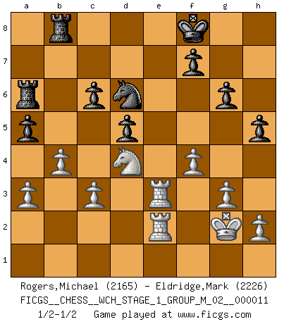Last move : 1/2-1/2 2012 December 4 22:28:9 [Event "FICGS__CHESS__WCH_STAGE_1_GROUP_M_02__000011"] [Site "FICGS"] [Date "2012.11.01"] [Round "1"] [White "Rogers,Michael"] [Black "Eldridge,Mark"] [Result "1/2-1/2"] [WhiteElo "2165"] [BlackElo "2226"] 1.e4 c5 2.Nf3 d6 3.d4 cxd4 4.Nxd4 Nf6 5.Nc3 g6 6.f4 Nc6 7.Nxc6 bxc6 8.e5 Nd7 9.exd6 exd6 10.Be3 Be7 11.Qd2 d5 12.Be2 O-O 13.O-O Re8 14.Bf3 Bf6 15.Bf2 Ba6 16.Rfd1 Qc7 17.Re1 Qa5 18.Red1 Bg7 19.Bd4 Rab8 20.a3 Bxd4+ 21.Qxd4 Qc5 22.Qxc5 Nxc5 23.b4 Ne6 24.Be2 Bxe2 25.Nxe2 Kg7 26.c3 Rb6 27.g3 a5 28.Rac1 Ra6 29.Rc2 Rb8 30.Kf2 h5 31.Rd3 Nc7 32.Nd4 Ne8 33.Re3 Kf8 34.Kg2 Nd6 35.Rce2 1/2-1/2 Sicilian : Dragon, Levenfish variation Kingside Castling by player Black (move 12) Kingside Castling by player White (move 13) This chess game ended in a draw. Follow this game move after move (download)Becoming successful at Chess allows you to discover your own personality. That's what I want for the kids I teach. (Saudin Robovic) Intelligenz läßt sich nicht am Weg, sondern nur am Ergebnis feststellen. (Garry Kasparov) La maestría del Ajedrez consiste esencialmente en analizar posiciónes de Ajedrez con precisión. (Mikhail Botvinnik) Botvinnik disait en comparant les échecs à la musique: Il existe une science dont le but est l'étude de l'acoustique et des sons. Mais il y a aussi un art qui se sert de l'océan des sons : c'est la musique. De toute évidence, il en est de même pour la pensée. La logique est l'étude des lois de la réflexion et les échecs reflètent, en tant qu'art, le côté logique de la réflexion, sous la forme d'images artistiques... Extrait de Fischer - Spassky, Reykjavik 1972 par Alexander & F. Wyndham (Ed. Solar), p 37. Quotation,n.: The act of repeating erroneously the words of another. The words erroneously repeated. (Ambrose Bierce, The Devil's Dictionary)