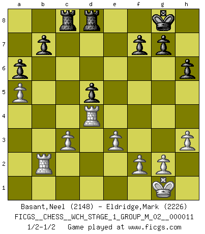 Last move : 1/2-1/2 2013 January 21 22:56:21 [Event "FICGS__CHESS__WCH_STAGE_1_GROUP_M_02__000011"] [Site "FICGS"] [Date "2012.11.01"] [Round "1"] [White "Basant,Neel"] [Black "Eldridge,Mark"] [Result "1/2-1/2"] [WhiteElo "2148"] [BlackElo "2226"] 1.d4 Nf6 2.Nf3 d5 3.c4 e6 4.Nc3 c6 5.e3 Nbd7 6.Qc2 a6 7.Be2 dxc4 8.a4 Be7 9.O-O Qc7 10.Bd2 O-O 11.a5 c5 12.Na4 cxd4 13.Nxd4 Rb8 14.Rfd1 Rd8 15.Rac1 Ne5 16.Nb6 Nd5 17.Nxc4 Nxc4 18.Bxc4 Bd7 19.h3 h6 20.Bxd5 Qxc2 21.Nxc2 exd5 22.Bb4 Bf6 23.Bc3 Bxc3 24.bxc3 Ba4 25.Rd4 Bxc2 26.Rxc2 Rbc8 27.Rb2 1/2-1/2 Queen's pawn game Kingside Castling by player White (move 9) Kingside Castling by player Black (move 10) This chess game ended in a draw. Follow this game move after move (download)Chess is everything: art, science and sport. (Anatoly Karpov) Ein Springer auf f6 gegen die eigene Rochadestellung ist schlimmer als ein rostiger Nagel im Knie. (Efim Bogoljubov) El juego de Fischer siempre fue nítido, racional y brillante. Uno de los mejores por siempre. (Dave Regis) A chaque perte on perd un peu de soi. (Joël Lautier) But they are useless. They can only give you answers. (Pablo Picasso, about computers)