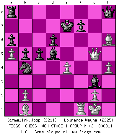 Last move : 1-0 2012 December 22 4:40:21 [Event "FICGS__CHESS__WCH_STAGE_1_GROUP_M_02__000011"] [Site "FICGS"] [Date "2012.11.01"] [Round "1"] [White "Simmelink,Joop"] [Black "Lowrance,Wayne"] [Result "1-0"] [WhiteElo "2211"] [BlackElo "2225"] 1.e4 e5 2.Nf3 Nc6 3.Bb5 a6 4.Ba4 Nf6 5.O-O Be7 6.Re1 b5 7.Bb3 d6 8.c3 O-O 9.h3 Re8 10.d4 Bb7 11.Nbd2 Bf8 12.a4 exd4 13.cxd4 h6 14.Bc2 Nb4 15.Bb1 c5 16.d5 Nd7 17.Ra3 g6 18.Nf1 Bg7 19.a5 Qc7 20.Ng3 Qd8 21.h4 h5 22.Bg5 Bf6 23.Nxh5 gxh5 24.Rae3 Kg7 25.Bf4 Ne5 26.Nxe5 Rxe5 27.Rg3+ Kf8 28.Bh6+ Ke7 29.f4 Qh8 30.fxe5 Bxe5 31.Qxh5 Bxg3 32.Rf1 Bxd5 33.Qg5+ 1-0 Ruy Lopez : Closed Kingside Castling by player White (move 5) Kingside Castling by player Black (move 8) Player White won this chess game. Follow this game move after move (download)Even the laziest King flees wildly in the face of a double check ! (Aaron Nimzowitsch) Was ist der Unterschied zwischen einem Strassenarbeiter und einem Schachspieler? --Der Schachspieler bewegt sich ab und zu. (Anonymous) El Jaque al descubierto es el bombardero del tablero. (Reuben Fine) Ce n'est pas pour s'amuser qu'il joue aux échecs : il célèbre un culte. (Vladimir Nabokov) I don't believe in psychology. I believe in good moves. (Bobby Fischer)