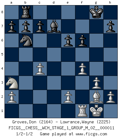 Last move : 1/2-1/2 2012 December 13 3:42:45 [Event "FICGS__CHESS__WCH_STAGE_1_GROUP_M_02__000011"] [Site "FICGS"] [Date "2012.11.01"] [Round "1"] [White "Groves,Don"] [Black "Lowrance,Wayne"] [Result "1/2-1/2"] [WhiteElo "2164"] [BlackElo "2225"] 1.d4 Nf6 2.c4 e6 3.Nf3 Bb4+ 4.Bd2 Qe7 5.g3 Bxd2+ 6.Qxd2 Nc6 7.Nc3 d5 8.Bg2 dxc4 9.O-O O-O 10.Ne5 Nxe5 11.dxe5 Nd7 12.Qd4 Qb4 13.f4 Qb6 14.Rad1 Rb8 15.Rd2 f6 16.Qxb6 Nxb6 17.exf6 gxf6 18.Nb5 Rf7 19.Na3 c3 20.bxc3 Rd7 21.Rxd7 Bxd7 22.c4 1/2-1/2 Bogo-Indian defense, Nimzovich variation Kingside Castling by player White (move 9) Kingside Castling by player Black (move 9) This chess game ended in a draw. Follow this game move after move (download)Chess is 99 percent tactics. (Teichmann) Wenn Spassky eine Figur opfert kannst du genauso gut aufgeben. Aber wenn Tal eine Figur opfert, spiel weiter. Er könnte noch eine weitere opfern, und dann ... wer weiß? (Miguel Najdorf) Aquel que toma al Peón de Caballo de la Reina, se pasará la noche a dormir en la calle. (Anónimo) Tous ces prétendus hommes politiques sont les pions, les Cavaliers, les Tours ou les Fous d'une partie d'échecs qui se jouera tant qu'un hasard ne renversera pas l'échiquier. (Honoré de Balzac) He who defends everything defends nothing. (Frederick the Great)