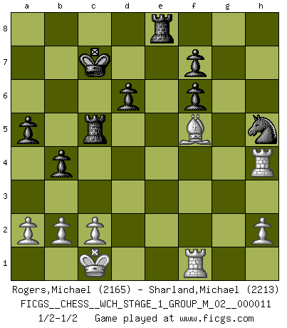 Last move : 1/2-1/2 2012 December 3 8:36:27 [Event "FICGS__CHESS__WCH_STAGE_1_GROUP_M_02__000011"] [Site "FICGS"] [Date "2012.11.01"] [Round "1"] [White "Rogers,Michael"] [Black "Sharland,Michael"] [Result "1/2-1/2"] [WhiteElo "2165"] [BlackElo "2213"] 1.e4 c5 2.Nf3 d6 3.d4 cxd4 4.Nxd4 Nf6 5.Nc3 a6 6.Bg5 e6 7.f4 Nbd7 8.Qf3 Qc7 9.O-O-O b5 10.Bd3 Bb7 11.Rhe1 Be7 12.Qg3 b4 13.Nd5 exd5 14.exd5 Kd8 15.Nc6+ Bxc6 16.dxc6 Nc5 17.Bh4 Rg8 18.Bf5 a5 19.Qe3 Ne6 20.g4 Re8 21.Qf3 Rc8 22.g5 Qxc6 23.Qxc6 Rxc6 24.gxf6 Bxf6 25.Bxf6+ gxf6 26.Bxh7 Nxf4 27.Rf1 Nh5 28.Rd4 Kc7 29.Rh4 Rc5 30.Bf5 1/2-1/2 Sicilian : Najdorf, 7.f4 Queenside Castling by player White (move 9) This chess game ended in a draw. Follow this game move after move (download)In complicated positions, Bobby Fischer hardly had to be afraid of anybody. (Paul Keres) Es macht mich traurig, wenn ich sehe, dass Golfprofis mehr verdienen als Schachsportler. Obwohl ich davon überzeugt bin, dass wir Schachspieler viel härter trainieren müssen als die Golfer. (Alexandra Kosteniuk) ¿Quién es tu oponente esta tarde? Esta tarde mi oponente son las piezas negras. (Akiba Rubinstein) Des points faibles ou des trous dans la position de l'adversaire doivent être occupés par des pièces et non pas par des pions. (Siegbert Tarrasch) Vladimir Ras-Putin is still alive... He is also a good actor, I saw him in the Lord of the Rings. (Rodolfo d'Ettorre)