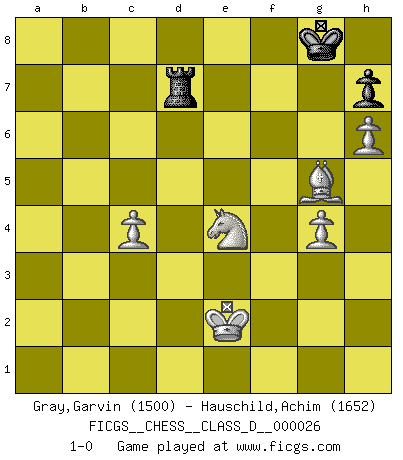 Last move : 1-0 2007 March 26 18:1:13 [Event "FICGS__CHESS__CLASS_D__000026"] [Site "FICGS"] [Date "2007.01.17"] [Round "1"] [White "Gray,Garvin"] [Black "Hauschild,Achim"] [Result "1-0"] [WhiteElo "1500"] [BlackElo "1652"] 1.e4 e6 2.Nf3 c5 3.d4 cxd4 4.Nxd4 Nc6 5.Nc3 d6 6.Be3 Nf6 7.Bc4 a6 8.Qe2 Be7 9.O-O-O Qc7 10.Bb3 O-O 11.g4 Nxd4 12.Rxd4 Nd7 13.h4 Nc5 14.Bg5 f6 15.Be3 b5 16.h5 Bb7 17.h6 g5 18.Kb1 Bc6 19.f3 Rfc8 20.Rb4 Bf8 21.a3 Rab8 22.Ba2 Bd7 23.Ka1 Qd8 24.Rd1 a5 25.Rxb5 Bxb5 26.Nxb5 Qd7 27.Bc4 Rb6 28.Nd4 R6b8 29.Bd2 Rb7 30.Bxa5 Ra8 31.Bd2 Qf7 32.Be3 d5 33.exd5 exd5 34.Bb5 Na4 35.Bc1 Bxa3 36.Bxa4 Bxb2+ 37.Bxb2 Rxa4+ 38.Kb1 Ra8 39.Nb3 Rb6 40.Qd2 Rd8 41.Qa5 Rbd6 42.Ba3 R6d7 43.Qb6 Re8 44.Bb2 Rf8 45.Nc5 R7d8 46.Kc1 Rc8 47.Qd6 Rcd8 48.Qe6 d4 49.Bxd4 Rfe8 50.Qxf6 Qxf6 51.Bxf6 Rxd1+ 52.Kxd1 Re3 53.Ne4 Rxf3 54.Bxg5 Rf7 55.c4 Rd7+ 56.Ke2 1-0 French defense Queenside Castling by player White (move 9) Kingside Castling by player Black (move 10) 10 pieces endgame at move 53 : White KBNPPP , Black KRPP WHITE : King + 1 Bishop 1 Knight 3 Pawns BLACK : King + 1 Rook 2 Pawns 9 pieces endgame at move 54 : White KBNPPP , Black KRP WHITE : King + 1 Bishop 1 Knight 3 Pawns BLACK : King + 1 Rook 1 Pawn Player White won this chess game. Follow this game move after move (download)All I want to do, ever, is just play Chess. (Bobby Fischer) Schach ist das Spiel, das die Verrückten gesund hält. (Albert Einstein) Mi estilo es algo parecido entre un poco de Tal y Petrosian. (Reshevsky) Pour moi, les échecs ne sont pas un jeu mais un art. (Alexandre Alekhine) Wisdom doesn't necessarily come with age. Sometimes age just shows up all by itself. (Tom Wilson)
