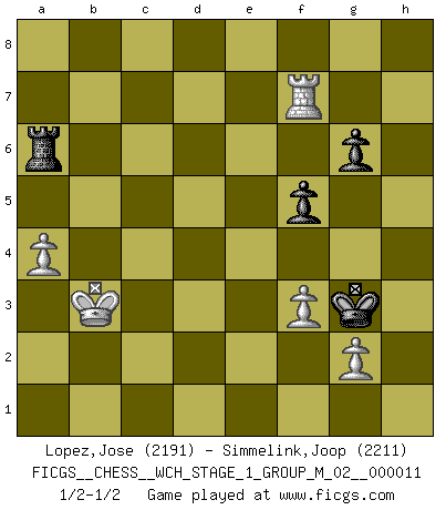 Last move : 1/2-1/2 2013 February 2 23:24:49 [Event "FICGS__CHESS__WCH_STAGE_1_GROUP_M_02__000011"] [Site "FICGS"] [Date "2012.11.01"] [Round "1"] [White "Lopez,Jose"] [Black "Simmelink,Joop"] [Result "1/2-1/2"] [WhiteElo "2191"] [BlackElo "2211"] 1.e4 c5 2.Nf3 d6 3.d4 cxd4 4.Nxd4 Nf6 5.Nc3 g6 6.Be3 Bg7 7.f3 Nc6 8.Qd2 O-O 9.Bc4 Bd7 10.O-O-O Rb8 11.Bb3 Na5 12.h4 b5 13.h5 Nc4 14.Bxc4 bxc4 15.Kb1 Qb6 16.b3 Qb4 17.Bg5 cxb3 18.cxb3 Rfe8 19.Bxf6 Bxf6 20.Nd5 Qxd4 21.Qxd4 Bxd4 22.Rxd4 Rb7 23.Rc1 Kg7 24.hxg6 hxg6 25.Rb4 Rxb4 26.Nxb4 a5 27.Nd5 Be6 28.Nc7 Rb8 29.Kb2 Bd7 30.Nd5 e6 31.Ne3 a4 32.Rd1 axb3 33.a3 d5 34.exd5 f5 35.Rd3 exd5 36.Rxb3 Rd8 37.Nxd5 Be6 38.Rb7+ Kh6 39.Nf4 Bg8 40.Rb6 Bf7 41.Ra6 Rd4 42.Rf6 Kg5 43.Rxf7 Kxf4 44.Kc3 Ra4 45.Kb3 Ra6 46.a4 Kg3 1/2-1/2 Sicilian : Dragon, Yugoslav attack Kingside Castling by player Black (move 8) Queenside Castling by player White (move 10) 10 pieces endgame at move 43 : White KRNPPP , Black KRPP WHITE : King + 1 Rook 1 Knight 3 Pawns BLACK : King + 1 Rook 2 Pawns 9 pieces endgame at move 43 : White KRPPP , Black KRPP WHITE : King + 1 Rook 3 Pawns BLACK : King + 1 Rook 2 Pawns This chess game ended in a draw. Follow this game move after move (download)My God, Bobby Fischer plays so simply. (Alexei Suetin) Offensichtlich kennt Kasparow nichts anderes als Schach, und ich könnte 500 weitere Spieler dieser Sorte benennen. (Judith Polgar) Fischer deseaba darle a los Rusos una sopa de su propia medicina. (Larry Evans) Ce qui caractérise les parties de combat, c'est que si le défenseur a constamment de difficiles problèmes à résoudre, l'attaquant doit chercher sans relâche de nouvelles possibilités d'attaque. (Koblentz) The faster the computer, the slower the brain. (Thibault de Vassal)