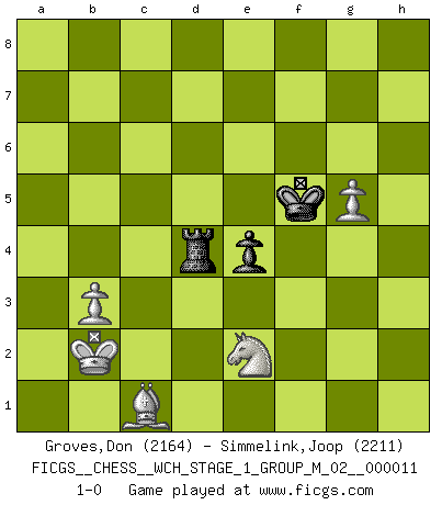 Last move : 1-0 2012 November 21 12:13:48 [Event "FICGS__CHESS__WCH_STAGE_1_GROUP_M_02__000011"] [Site "FICGS"] [Date "2012.11.01"] [Round "1"] [White "Groves,Don"] [Black "Simmelink,Joop"] [Result "1-0"] [WhiteElo "2164"] [BlackElo "2211"] 1.d4 Nc6 2.d5 Ne5 3.e4 e6 4.dxe6 fxe6 5.Nc3 b6 6.f4 Nf7 7.Bd3 Bb7 8.Nf3 a6 9.e5 Bb4 10.Bd2 Bxc3 11.Bxc3 Ne7 12.Qe2 c5 13.O-O O-O 14.a4 a5 15.Bd2 Bc6 16.b3 Nf5 17.Rae1 Qe7 18.Qf2 h5 19.Bxf5 exf5 20.Nh4 Qe6 21.Re3 g5 22.fxg5 f4 23.Qxf4 Nd6 24.exd6 Rxf4 25.Rxe6 Rxf1+ 26.Kxf1 dxe6 27.Ng6 Be4 28.Ne5 Bxc2 29.Nc6 Kf8 30.d7 Be4 31.Ne5 Ke7 32.g6 Bxg6 33.Nxg6+ Kxd7 34.Ne5+ Kd6 35.Nc4+ Kc6 36.g3 b5 37.Nxa5+ Kd5 38.axb5 Rb8 39.h3 e5 40.Ke2 Rxb5 41.g4 hxg4 42.hxg4 Rb6 43.g5 Ke6 44.Kd3 Rb8 45.Kc4 Kd6 46.Be3 Rb4+ 47.Kc3 Kd5 48.Nc4 Rb8 49.Nb2 Rg8 50.Nd3 Ke4 51.Bc1 Kd5 52.Nf2 Rh8 53.Be3 Rc8 54.Ng4 Ke4 55.Bc1 Rh8 56.Kc4 Kf5 57.Nf2 Rh4+ 58.Kxc5 Rh7 59.Kb4 Rb7+ 60.Kc3 Rc7+ 61.Kb2 e4 62.Nd1 Rd7 63.Nc3 Rd4 64.Ne2 1-0 Queen's pawn : Lundin (Kevitz-Mikenas) defense Kingside Castling by player White (move 13) Kingside Castling by player Black (move 13) 10 pieces endgame at move 41 : White KBNPP , Black KRPPP WHITE : King + 1 Bishop 1 Knight 2 Pawns BLACK : King + 1 Rook 3 Pawns 9 pieces endgame at move 42 : White KBNPP , Black KRPP WHITE : King + 1 Bishop 1 Knight 2 Pawns BLACK : King + 1 Rook 2 Pawns 8 pieces endgame at move 58 : White KBNPP , Black KRP WHITE : King + 1 Bishop 1 Knight 2 Pawns BLACK : King + 1 Rook 1 Pawn Player White won this chess game. Follow this game move after move (download)Only sissies Castle. (Rob Sillars) Das ganze Leben mit einer Ehefrau ist wie ein Endspiel mit ungleichfarbigen Läufern. (Viktor Kortschnoi) Todo se encuentra en un estado de flujo y esto incluye al mundo del Ajedrez. (Mikhail Botvinnik) Il (Jacob Murray) ne joue pas pour le bon coup, mais pour le meilleur. (Eloi Relange) Life doesn't imitate art, it imitates bad television. (Woody Allen)