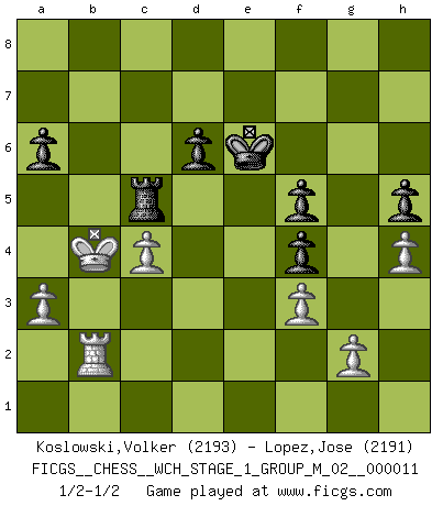 Last move : 1/2-1/2 2013 January 17 23:40:33 [Event "FICGS__CHESS__WCH_STAGE_1_GROUP_M_02__000011"] [Site "FICGS"] [Date "2012.11.01"] [Round "1"] [White "Koslowski,Volker"] [Black "Lopez,Jose"] [Result "1/2-1/2"] [WhiteElo "2193"] [BlackElo "2191"] 1.e4 c5 2.Nf3 Nc6 3.d4 cxd4 4.Nxd4 Nf6 5.Nc3 e5 6.Ndb5 d6 7.Bg5 a6 8.Na3 b5 9.Bxf6 gxf6 10.Nd5 f5 11.Bd3 Be6 12.O-O Bxd5 13.exd5 Ne7 14.Nxb5 Bg7 15.Nc3 e4 16.Bc4 Ng6 17.Qh5 Bxc3 18.bxc3 Qf6 19.Qh6 Qxc3 20.Be2 Qe5 21.Rab1 Qf4 22.Qg7 Qe5 23.Qxe5+ Nxe5 24.f3 O-O 25.Rb6 Rfc8 26.Rc1 Nd3 27.Bxd3 exd3 28.Rc6 d2 29.Rd1 Rxc6 30.dxc6 Rc8 31.Kf2 Rxc6 32.Rxd2 Kf8 33.Ke3 Ke7 34.Kd4 Rc5 35.c4 Ra5 36.Kc3 f4 37.Kb4 Rg5 38.a3 Ke6 39.h3 f6 40.Re2+ Re5 41.Rc2 h5 42.h4 Rc5 43.Re2+ Re5 44.Rd2 Rc5 45.Rd4 f5 46.Rd3 Re5 47.Rd2 Rc5 48.Rb2 1/2-1/2 Sicilian : Pelikan (Lasker/Sveshnikov) variation Kingside Castling by player White (move 12) Kingside Castling by player Black (move 24) This chess game ended in a draw. Follow this game move after move (download)No price is too great for the scalp of the enemy King. (Koblentz) Zum Sieg gelangt man nicht, wenn man gut, sondern nur wenn man besser spielt (Savielly Grigorievitsch Tartakower) El Ajedrez, como cualquier otra actividad creativa, puede existir solo a través de méritos combinados de aquellos que tienen talento creativo y de aquellos que tienen la habilidad de organizar un trabajo creativo. (Mikhail Botvinnik) Les échecs sont plus proches de l'art de l'assassinat que de l'art de la guerre. (Arturo Perez-Reverte) When you've done things right people won't know you've done anything at all. (Futurama)