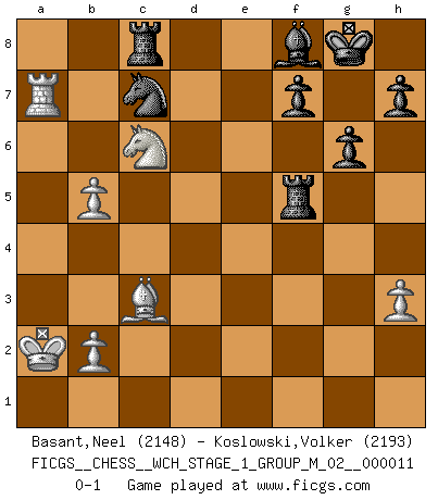Last move : 0-1 2013 March 27 9:36:7 [Event "FICGS__CHESS__WCH_STAGE_1_GROUP_M_02__000011"] [Site "FICGS"] [Date "2012.11.01"] [Round "1"] [White "Basant,Neel"] [Black "Koslowski,Volker"] [Result "0-1"] [WhiteElo "2148"] [BlackElo "2193"] 1.d4 d5 2.Nf3 Nf6 3.c4 c6 4.h3 Bf5 5.Qb3 Qb6 6.c5 Qxb3 7.axb3 Na6 8.Bd2 g6 9.Ba5 Bxb1 10.Rxb1 b6 11.Bd2 bxc5 12.e3 Nc7 13.Ba5 Ne6 14.Ba6 Rb8 15.b4 cxd4 16.Ne5 dxe3 17.fxe3 Bh6 18.Nxc6 O-O 19.Ke2 Rbe8 20.Rhd1 Ng7 21.Bd3 e5 22.Ra1 d4 23.e4 Nfh5 24.Bc7 Nf4+ 25.Kf3 Nge6 26.Bxe5 Nxd3 27.Rxd3 Ng5+ 28.Ke2 Re6 29.Ra6 Rfe8 30.Bxd4 Rxe4+ 31.Kd1 Re2 32.Rxa7 Rxg2 33.Re7 Ra8 34.Ra3 Rc8 35.b5 Ne6 36.Bc3 Rg1+ 37.Kc2 Rc1+ 38.Kb3 Bf8 39.R3a7 Rf1 40.Ka2 Rf5 41.Rec7 Nxc7 0-1 Comment by player 1 : Neel Basant : Played Rec7 mistakenly in place of Reb7. Queen's pawn game Kingside Castling by player Black (move 18) Player Black won this chess game. Follow this game move after move (download)The defensive power of a pinned piece is only imaginary. (Aaron Nimzovich) Garry Kasparov war erst in der Großmeister-Organisation GMA, dann in der Profischach-Vereinigung PCA, zum Schluss kehrte er wieder in den Schoß der FIDE zurück. Aber gut, manche Leute sind flexibel (Viswanathan Anand) Un entendimiento a fondo de las continuaciones típicas del mate, hace de las combinaciones de sacrificio mas complicadas conducirlas a ellas no solo sin dificultad, sino casi de una manera natural. (Siegbert Tarrasch) Soyez une menace à chaque fois que vous vous asseyez pour jouer. (Ken Smith) Winning isn't everything... but losing is nothing. (Mednis)
