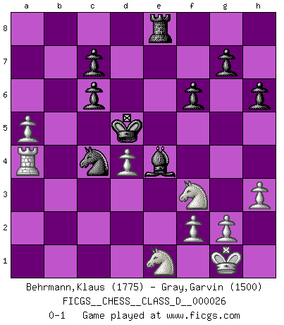 Last move : 0-1 2007 March 7 3:59:34 [Event "FICGS__CHESS__CLASS_D__000026"] [Site "FICGS"] [Date "2007.01.17"] [Round "1"] [White "Behrmann,Klaus"] [Black "Gray,Garvin"] [Result "0-1"] [WhiteElo "1775"] [BlackElo "1500"] 1.b3 e5 2.Bb2 Nc6 3.e3 d5 4.Bb5 Bd6 5.Bxc6+ bxc6 6.Nf3 Qe7 7.O-O Nf6 8.d4 exd4 9.exd4 O-O 10.c4 dxc4 11.Re1 Be6 12.bxc4 Rab8 13.Bc3 Rfe8 14.Nbd2 Bb4 15.Bxb4 Qxb4 16.a3 Qb6 17.Qc2 h6 18.Reb1 Qa6 19.Rxb8 Rxb8 20.Qc3 Ne8 21.Re1 Nd6 22.Ne5 Re8 23.Nd3 Qc8 24.Re3 Nf5 25.Re4 Nd6 26.Re5 f6 27.Ra5 Bf5 28.Rxa7 Qe6 29.Nf3 Qe2 30.Nde1 Nxc4 31.h3 Re7 32.Rb7 Be4 33.Rb8+ Kf7 34.a4 Nd6 35.Rb2 Qd1 36.Qb3+ Qxb3 37.Rxb3 Re8 38.Rb4 Ke6 39.a5 Kd5 40.Ra4 Nc4 0-1 Nimzovich-Larsen attack : Modern variation Kingside Castling by player White (move 7) Kingside Castling by player Black (move 9) Player Black won this chess game. Follow this game move after move (download)You sit at the board and suddenly your heart leaps. Your hand trembles to pick up the piece and move it. But what Chess teaches you is that you must sit there calmly and think about whether it's really a good idea and whether there are other better ideas. (Stanley Kubrick) Karpov ist ein Museumsstück. (Garry Kasparov) El hombre es un frívolo, una creatura engañosa y como un jugador de Ajedrez, se preocupa mas por el proceso de obtener su meta que de la meta por sí misma. (Dostoyevsky) Les Echecs, c'est l'art de la guerre sans les charniers, c'est la résurrection des morts tombés au champ d'honneur, l'espoir perpétuel, la suprématie de l'intelligence sur la force, la culture de l'esprit. (F. Szpiner) Lamb in skin of tiger, still fears the wolf. (Chinese proverb)