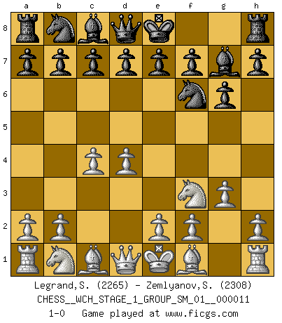 Last move : 1-0 2012 December 26 23:8:59 [Event "FICGS__CHESS__WCH_STAGE_1_GROUP_SM_01__000011"] [Site "FICGS"] [Date "2012.11.01"] [Round "1"] [White "Legrand,Stephane"] [Black "Zemlyanov,Sergey"] [Result "1-0"] [WhiteElo "2265"] [BlackElo "2308"] 1.d4 Nf6 2.c4 g6 3.Nf3 Bg7 4.g3 1-0 This chess game has been lost on time (started : 2012.11.01 19:54:40) King's Indian, 3.Nf3 Player White won this chess game. Follow this game move after move (download)You cannot play at Chess if you are kind-hearted. (French Proverb) Darum geht es im Schach. Einen Tag gibst du deinem Gegner eine Lektion, am nächsten Tag gibt er dir eine. (Robert James Fischer) El Ajedrez detiene a su maestro dentro de sus propios vínculos, encadenando la mente y el cerebro, por lo que la libertad interior del mas fuerte debe sufrir. (Albert Einstein) Des idées, des idées, j'en ai cent, j'en ai mille. Des bonnes, des mauvaises, applicables, irréalisables... Il suffit de faire le tri ! (Roos) Programming can only do so much before it becomes too much. (Don Groves)