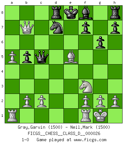 Last move : 1-0 2007 April 10 10:40:32 [Event "FICGS__CHESS__CLASS_D__000026"] [Site "FICGS"] [Date "2007.01.17"] [Round "1"] [White "Gray,Garvin"] [Black "Neil,Mark"] [Result "1-0"] [WhiteElo "1500"] [BlackElo "1500"] 1.e4 d5 2.exd5 Qxd5 3.Nc3 Qd6 4.d4 Nf6 5.Nf3 a6 6.Bc4 b5 7.Bd3 Bb7 8.Qe2 Nbd7 9.O-O c5 10.Ne4 Nxe4 11.Bxe4 Bxe4 12.Qxe4 Rd8 13.Bf4 Qb6 14.a4 Nf6 15.a5 Qa7 16.Qc6+ Nd7 17.dxc5 Qxc5 18.Qxa6 g6 19.Qb7 e5 20.Bxe5 1-0 Scandinavian : Pytel-Wade variation Kingside Castling by player White (move 9) Player White won this chess game. Follow this game move after move (download)It is always better to sacrifice your opponent's men. (Savielly Tartakower) Ich war zu klein für die Schach-Schülermannschaft! (Woody Allen) El estómago es una parte esencial del maestro de Ajedrez. (Bent Larsen) Vous savez, camarade Pachman, je n'éprouve pas de plaisir à être ministre, je jouerais plutôt aux échecs comme vous, ou alors ferais une révolution au Venezuela. (Che Guevara à Ludek Pachman, 'Checkmate in Prague', 1975) Good luck. You're gonna need it. (Han Solo in Star Wars ep.6)