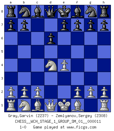 Last move : 1-0 2012 December 26 23:8:59 [Event "FICGS__CHESS__WCH_STAGE_1_GROUP_SM_01__000011"] [Site "FICGS"] [Date "2012.11.01"] [Round "1"] [White "Gray,Garvin"] [Black "Zemlyanov,Sergey"] [Result "1-0"] [WhiteElo "2237"] [BlackElo "2308"] 1.e4 c5 2.Nf3 d6 3.d4 cxd4 4.Nxd4 1-0 This chess game has been lost on time (started : 2012.11.01 19:54:40) Sicilian Player White won this chess game. Follow this game move after move (download)Nothing excites jaded Grandmasters more than a theoretical novelty. (Dominic Lawson) Ich tröste mich mit dem Vergnügen, daß Schachfans, Zuschauer und Leser glücklich sind, wenn ein Großmeister etwas riskiert, statt nur Klötzchen zu schieben. (Mikhail Nekhemyevich Tal) El Ajedrez, como cualquier otra actividad creativa, puede existir solo a través de méritos combinados de aquellos que tienen talento creativo y de aquellos que tienen la habilidad de organizar un trabajo creativo. (Mikhail Botvinnik) Il n'y a pas de prix trop élevé au scalp de l'ennemi. (Koblentz) I teach you to lie, cheat and steal, and as soon as my back's turned you wait in line ? (Gregory House, House M.D.)