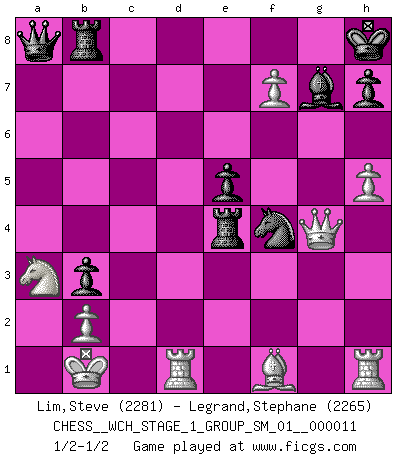 Last move : 1/2-1/2 2012 December 15 14:4:33 [Event "FICGS__CHESS__WCH_STAGE_1_GROUP_SM_01__000011"] [Site "FICGS"] [Date "2012.11.01"] [Round "1"] [White "Lim,Steve"] [Black "Legrand,Stephane"] [Result "1/2-1/2"] [WhiteElo "2281"] [BlackElo "2265"] 1.e4 c5 2.Nf3 d6 3.d4 cxd4 4.Nxd4 Nf6 5.Nc3 a6 6.Be3 e5 7.Nb3 Be6 8.f3 Be7 9.Qd2 O-O 10.O-O-O Nbd7 11.g4 b5 12.g5 b4 13.Ne2 Ne8 14.f4 a5 15.f5 a4 16.Nbd4 exd4 17.Nxd4 b3 18.Kb1 bxc2+ 19.Nxc2 Bb3 20.axb3 axb3 21.Na3 Ne5 22.h4 Ra4 23.Qg2 Qa8 24.Bd4 Nc7 25.h5 Rb8 26.f6 Bf8 27.Bxe5 dxe5 28.g6 Ne6 29.Rd7 Rxe4 30.gxf7+ Kh8 31.Rd1 Nf4 32.fxg7+ Bxg7 33.Qg4 1/2-1/2 Sicilian : Najdorf, Byrne (English) attack Kingside Castling by player Black (move 9) Queenside Castling by player White (move 10) This chess game ended in a draw. Follow this game move after move (download)You sit at the board and suddenly your heart leaps. Your hand trembles to pick up the piece and move it. But what Chess teaches you is that you must sit there calmly and think about whether it's really a good idea and whether there are other better ideas. (Stanley Kubrick) Karpov ist ein Museumsstück. (Garry Kasparov) Cuando tu casa esta en llamas, no puedes ser molestado por tus vecinos. O, como decinos en Ajedrez, si tu Rey esta bajo ataque, no te preocupa perder un Peón del lado de la Reina. (Gary Kasparov) Ce qui caractérise les parties de combat, c'est que si le défenseur a constamment de difficiles problèmes à résoudre, l'attaquant doit chercher sans relâche de nouvelles possibilités d'attaque. (Koblentz) It's not enough to succeed. Others must fail. (Gore Vidal)