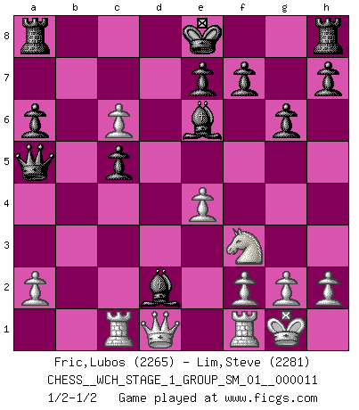 Last move : 1/2-1/2 2012 December 12 11:6:59 [Event "FICGS__CHESS__WCH_STAGE_1_GROUP_SM_01__000011"] [Site "FICGS"] [Date "2012.11.01"] [Round "1"] [White "Fric,Lubos"] [Black "Lim,Steve"] [Result "1/2-1/2"] [WhiteElo "2265"] [BlackElo "2281"] 1.Nf3 Nf6 2.c4 g6 3.d4 Bg7 4.Nc3 d5 5.cxd5 Nxd5 6.e4 Nxc3 7.bxc3 c5 8.Bb5+ Nc6 9.d5 Qa5 10.Rb1 Bxc3+ 11.Bd2 a6 12.Bxc6+ bxc6 13.dxc6 Be6 14.Rc1 Bb4 15.O-O Bxd2 1/2-1/2 Reti Opening Kingside Castling by player White (move 15) This chess game ended in a draw. Follow this game move after move (download)It is always better to sacrifice your opponent's men. (Savielly Tartakower) Meine Liebe ist Schach, Schach, Schach. Ich muss jeden Tag Schach spielen, deshalb fühle ich mich so stark. (Miguel Najdorf) En la perfecta combinación de Ajedrez como en una historia corta de primera clase, toda la trama y contra trama deberá conducir hacia un final sorprendente, el interes no es mitigado hasta el último momento. (Yates and Winter) Même un GMI sait rarement calculer sur plus de cinq coups une attaque à sacrifices. (Rudolf Spielmann) Are you threatening me, Master Jedi ? (Chancellor Palpatine in Star Wars ep.3)