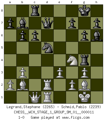 Last move : 1-0 2013 February 20 15:59:18 [Event "FICGS__CHESS__WCH_STAGE_1_GROUP_SM_01__000011"] [Site "FICGS"] [Date "2012.11.01"] [Round "1"] [White "Legrand,Stephane"] [Black "Schmid,Pablo"] [Result "1-0"] [WhiteElo "2265"] [BlackElo "2239"] 1.d4 Nf6 2.c4 g6 3.g3 Bg7 4.Bg2 d5 5.cxd5 Nxd5 6.Nf3 Nb6 7.Nc3 Nc6 8.e3 O-O 9.O-O Re8 10.Ne1 e5 11.d5 Na5 12.Nc2 e4 13.Nxe4 Nxd5 14.Nd4 Nc4 15.b3 Ne5 16.Ba3 b6 17.Qc2 Bb7 18.Rad1 Qd7 19.Rd2 Ng4 20.Qc1 Bh6 21.Nc2 Qf5 22.h3 Rxe4 23.hxg4 Rxg4 24.Nd4 Qd7 25.Ne2 c6 26.Nf4 Re8 27.Rfd1 Rc8 28.Bb2 1-0 This chess game has been lost on time (started : 2012.11.01 19:54:40) King's Indian : 3.g3, counterthrust variation Kingside Castling by player Black (move 8) Kingside Castling by player White (move 9) Player White won this chess game. Follow this game move after move (download)Of all my Russian books, the defense contains and diffuses the greatest 'warmth' which may seem odd seeing how supremely abstract Chess is supposed to be. (Vladimir Nabokov) Schach ist Kampf, hauptsächlich jedoch gegen die eigenen Fehler. (Savielly Grigorievitsch Tartakower) Los Peones son el alma de una partida de Ajedrez. (Francois Andre Danican Philidor) Les Echecs mettent en conflit, non pas deux intelligences, mais deux volontés. (Lasker) Memory is a crazy woman that hoards colored rags and throws away food. (Austin O'Malley)