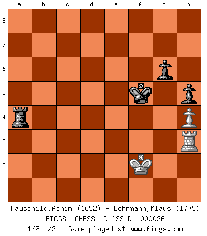 Last move : 1/2-1/2 2007 March 15 1:4:24 [Event "FICGS__CHESS__CLASS_D__000026"] [Site "FICGS"] [Date "2007.01.17"] [Round "1"] [White "Hauschild,Achim"] [Black "Behrmann,Klaus"] [Result "1/2-1/2"] [WhiteElo "1652"] [BlackElo "1775"] 1.c4 e5 2.Nc3 Nf6 3.Nf3 Nc6 4.g3 d5 5.cxd5 Nxd5 6.d3 Bb4 7.Bd2 O-O 8.Bg2 Nf6 9.O-O Be7 10.Rc1 Re8 11.Qa4 Bd7 12.Qb3 Rb8 13.Ng5 Rf8 14.f4 Nd4 15.Qd1 exf4 16.Rxf4 Ne6 17.Nxe6 Bxe6 18.Qa4 a6 19.Ne4 Nxe4 20.Bxe4 Bg5 21.Qc2 c6 22.Rf2 Bxa2 23.Rcf1 Bxd2 24.Qxd2 Bd5 25.Bxd5 Qxd5 26.Qc3 Rbd8 27.Rf5 Qd4+ 28.Kg2 Rfe8 29.Qb3 Rxe2+ 30.Kh3 Qd7 31.Qxf7+ Qxf7 32.Rxf7 Rxb2 33.Rc7 Rb5 34.R1f7 Rg5 35.Rxb7 h6 36.Rbd7 Rxd7 37.Rxd7 Rd5 38.Ra7 Rxd3 39.Rxa6 Rd6 40.Ra7 Kh7 41.Rc7 Kg6 42.Kg4 h5+ 43.Kf4 Kf6 44.Rc8 g6 45.h4 Rd4+ 46.Ke3 Rc4 47.Kd3 Rg4 48.Rxc6+ Ke5 49.Rc5+ Ke6 50.Rc6+ Kd5 51.Rc1 Rxg3+ 52.Ke2 Ke6 53.Kf2 Rg4 54.Rh1 Kf5 55.Rh3 Ra4 1/2-1/2 English Opening Kingside Castling by player Black (move 7) Kingside Castling by player White (move 9) 10 pieces endgame at move 38 : White KRPP , Black KRPPPP WHITE : King + 1 Rook 2 Pawns BLACK : King + 1 Rook 4 Pawns 9 pieces endgame at move 39 : White KRPP , Black KRPPP WHITE : King + 1 Rook 2 Pawns BLACK : King + 1 Rook 3 Pawns 8 pieces endgame at move 48 : White KRPP , Black KRPP WHITE : King + 1 Rook 2 Pawns BLACK : King + 1 Rook 2 Pawns 7 pieces endgame at move 51 : White KRP , Black KRPP WHITE : King + 1 Rook 1 Pawn BLACK : King + 1 Rook 2 Pawns This chess game ended in a draw. Follow this game move after move (download)Pawn endings are to Chess what putting is to golf. (Cecil Purdy) Am wohlsten fühle ich mich, wenn ich sehe, wie sich mein Gegner im Todeskampf windet. (Robert James Fischer) El muchacho (en ese entonces un niño de 12 años llamado Anatoly Karpov) no tiene ni idea de lo que es el Ajedrez y no hay futuro en absoluto para el en esta profesión. (Mikhail Botvinnik) Mais l'homme est une créature légère et illogique : semblable au joueur d'échecs, il n'aime que le processus du but à atteindre, non le but lui-même. (Dostoïevsky) It is not titles that honor men, but men that honor titles. (Niccolo Machiavelli)