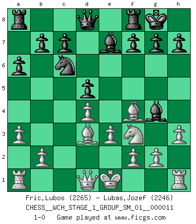 Last move : 1-0 2013 January 29 13:20:13 [Event "FICGS__CHESS__WCH_STAGE_1_GROUP_SM_01__000011"] [Site "FICGS"] [Date "2012.11.01"] [Round "1"] [White "Fric,Lubos"] [Black "Lubas,Jozef"] [Result "1-0"] [WhiteElo "2265"] [BlackElo "2246"] 1.Nf3 Nf6 2.c4 e6 3.d4 d5 4.Nc3 Be7 5.Bf4 O-O 6.e3 Nc6 7.a3 a6 8.cxd5 Nxd5 9.Nxd5 exd5 10.Bd3 Bg4 11.h3 1-0 This chess game has been lost on time (started : 2012.11.01 19:54:40) Reti Opening Kingside Castling by player Black (move 5) Player White won this chess game. Follow this game move after move (download)Chess is like war on a board. (Bobby Fischer) Ich verstehe Aljechins Kombinationen ganz gut; aber woher er diese Angriffschancen bekommt und wie er die Eröffnung behandelt das ist für mich ein Buch mit sieben Siegeln. (Rudolf Spielmann) Solo los afeminados hacen el Enroque. (Rob Sillars) Le plus grand jeu de l'esprit jamais inventé, plus vous l'apprenez, plus vous y prenez du plaisir. (Garry Kasparov) Fame, I have already. Now I need the money. (an elderly Steinitz)