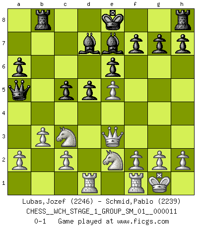 Last move : 0-1 2013 February 22 16:1:49 [Event "FICGS__CHESS__WCH_STAGE_1_GROUP_SM_01__000011"] [Site "FICGS"] [Date "2012.11.01"] [Round "1"] [White "Lubas,Jozef"] [Black "Schmid,Pablo"] [Result "0-1"] [WhiteElo "2246"] [BlackElo "2239"] 1.e4 c6 2.d4 d5 3.e5 c5 4.dxc5 Nc6 5.Bb5 e6 6.Be3 Nge7 7.Nf3 Nf5 8.Qd3 Nxe3 9.Qxe3 Qa5+ 10.Nc3 a6 11.Bxc6+ bxc6 12.O-O Bxc5 13.Nd4 Rb8 14.b3 Bd7 15.Rad1 Be7 16.Nde2 c5 0-1 This chess game has been lost on time (started : 2012.11.01 19:54:40) Caro-Kann : Advance variation Kingside Castling by player White (move 12) Player Black won this chess game. Follow this game move after move (download)Good offense and good defense both begin with good development. (Bruce A. Moon) Schach ist ein Kampf gegen den Fehler. (Johannes Herrman Zukertort) Un juego de Ajedrez es un dialogo, una conversación entre un jugador y su oponente. Cada movimiento del oponente puede contener amenazas o tropiezos, pero un jugador no se puede defender de las amenazas o tomar ventaja de los tropiezos si es que no se pregunta a sí mismo: ¿Que es lo que mi oponente va a hacer después de cada movida?. (Bruce A. Moon) Une platitude souvent récitée à propos des Echecs est qu'une des choses les plus difficiles à réaliser est de gagner une position gagnante. Cela ne manque pas de sens mais, pour ma part, j'ai toujours trouvé plus difficile de gagner une position perdante. (Tim Krabbe) Always two there are. No more no less. A master, and an apprentice. (Master Yoda in Star Wars ep.1)