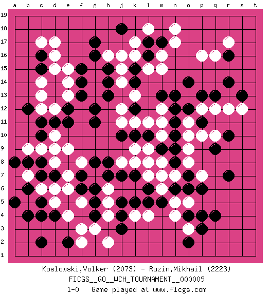 Last move : 1-0 2013 April 24 13:7:18 [Event "FICGS__GO__WCH_TOURNAMENT__000009"] [Site "FICGS"] [Date "2012.11.01"] [Round "1"] [Black "Koslowski,Volker"] [White "Ruzin,Mikhail"] [Result "1-0"] [Rating 1 "2073"] [Rating 2 "2223"] 1.q4 d16 2.r16 p16 3.d4 c6 4.j3 d10 5.r14 k16 6.m17 r17 7.p11 q16 8.k12 m16 9.l16 l15 10.l17 m15 11.k15 j16 12.k14 n17 13.j18 n18 14.h15 h16 15.g16 k17 16.g17 l18 17.c15 d15 18.d14 e14 19.d13 g15 20.f15 g14 21.f14 e15 22.f13 e13 23.e12 d12 24.c16 d17 25.e11 c17 26.d11 c12 27.c11 c14 28.b12 c13 29.b4 e6 30.f7 f5 31.j5 f3 32.e2 b5 33.c10 f2 34.c5 d5 35.c4 e4 36.b6 b7 37.c2 g13 38.g12 j15 39.h14 j14 40.h13 k13 41.d7 d6 42.r7 o3 43.o4 n4 44.p3 o5 45.p4 n5 46.o2 k4 47.j4 o8 48.n8 o9 49.o7 p7 50.p6 n7 51.o6 m7 52.l8 m8 53.n9 o11 54.m9 l9 55.n11 o10 56.l10 k9 57.n6 m6 58.l6 l7 59.k7 k8 60.m5 l8 61.k5 l4 62.l5 m10 63.n10 m11 64.n12 m12 65.o12 p12 66.m13 l11 67.k10 k11 68.j10 o13 69.n13 j8 70.p13 q12 71.h8 j11 72.j7 j12 73.a5 e7 74.e8 d8 75.c8 d9 76.c7 c9 77.b8 b9 78.a8 f8 79.f6 e9 80.g11 g7 81.g6 h6 82.g5 h5 83.g4 h4 84.g8 g3 85.h7 h2 86.q13 r12 87.r10 q10 88.q9 p10 89.s13 s12 90.o14 1-0 Here are the names of the openings (joseki) played in the four corners : Corner q16 : r16 p16 Komoku (Somok, Xiao~mu`) 3-4 Point. The komoku (3-4) point is the traditional corner enclosure move.. Ikken Takagakari (Hankan Nop'dakeolch'im, Yi Gaogua`jiao~, 1-Space High Approach). The 5-4 approach move has become more popular in modern times, as modern Go emphasizes speed and influence. Corner d4 : d4 c6 Hoshi (Hwajeom, Seongjeom, Xingwei`) 4-4 Point. The star or hoshi (4-4) point, emphasizing influence at the potential expense of territory. Ikken Kakari (Hankan Keolch'im, Yi Gua`jiao~, 1-Space Low Approach). White 2 is the standard approach move to the 4-4. Player Black won this Go (weiqi, baduk) game. Follow this game move after move (download)The intersection is rarely neutral. (Pierre Audouard) Computers are like Old Testament gods; lots of rules and no mercy. (Joseph Campbell)