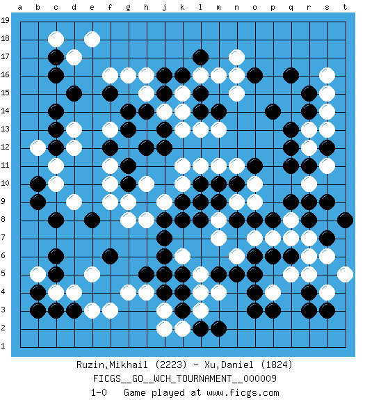 Last move : 1-0 2012 November 16 5:36:52 [Event "FICGS__GO__WCH_TOURNAMENT__000009"] [Site "FICGS"] [Date "2012.11.01"] [Round "1"] [Black "Ruzin,Mikhail"] [White "Xu,Daniel"] [Result "1-0"] [Rating 1 "2223"] [Rating 2 "1824"] 1.q16 d4 2.r4 d17 3.p3 r10 4.r8 r13 5.d15 f16 6.c17 c18 7.c16 e18 8.c12 n17 9.k16 n15 10.o16 n16 11.p14 s16 12.r14 s14 13.r15 s15 14.q13 r12 15.q11 k14 16.l14 k15 17.l15 l16 18.j16 h15 19.j15 j14 20.h14 h13 21.g14 h16 22.l17 m16 23.j13 k13 24.j12 l13 25.f15 g16 26.m14 m13 27.c6 d9 28.f6 f3 29.k4 c11 30.c8 b12 31.b10 d12 32.c13 c10 33.b9 d13 34.c14 f13 35.g13 f11 36.g11 f10 37.g10 g9 38.h9 g12 39.h12 h10 40.f12 g8 41.e8 f9 42.j7 h8 43.j8 j9 44.k9 k10 45.l10 l9 46.k8 l11 47.m10 k11 48.d3 e3 49.c3 c4 50.b4 b5 51.b3 e5 52.c5 j3 53.k3 k2 54.l2 j2 55.j4 h4 56.h5 g4 57.r11 s11 58.s12 s13 59.q12 s4 60.r3 r7 61.s7 s8 62.s9 q8 63.r9 s6 64.t8 r5 65.q6 q7 66.q9 q5 67.p6 p4 68.o3 o7 69.o6 o9 70.n10 o10 71.o11 n11 72.n8 n6 73.o5 n9 74.m9 m8 75.l8 m7 76.o4 r6 77.s3 t5 78.p8 p7 79.o8 m11 80.l9 k6 81.j6 m4 82.m5 l5 83.n5 l3 84.m2 j5 85.k5 l4 86.j5 1-0 Here are the names of the openings (joseki) played in the four corners : Corner q16 : q16 r13 Hoshi (Hwajeom, Seongjeom, Xingwei`) 4-4 Point. The star or hoshi (4-4) point, emphasizing influence at the potential expense of territory. Niken Kakari (Dukan Keolch'im, E`r Gua`jiao~, 2-Space Low Approach). Black typically answers by 7-3 or 3-5 (which is not joseki). Corner d16 : d17 d15 Komoku (Somok, Xiao~mu`) 3-4 Point. The komoku (3-4) point is the traditional corner enclosure move.. Ikken Takagakari (Hankan Nop'dakeolch'im, Yi Gaogua`jiao~, 1-Space High Approach). The 5-4 approach move has become more popular in modern times, as modern Go emphasizes speed and influence. Corner d4 : d4 c6 Hoshi (Hwajeom, Seongjeom, Xingwei`) 4-4 Point. The star or hoshi (4-4) point, emphasizing influence at the potential expense of territory. Ikken Kakari (Hankan Keolch'im, Yi Gua`jiao~, 1-Space Low Approach). Black 2 is the standard approach move to the 4-4. Player Black won this Go (weiqi, baduk) game. Follow this game move after move (download)While the Baroque rules of chess could only have been created by humans, the rules of go are so elegant, organic, and rigorously logical that if intelligent life forms exist elsewhere in the universe, they almost certainly play go. (Edward Lasker, international chess master) CHESS, n. f. [echecs, Fr.] A nice and abstruse game, in which two sets of puppets are moved in opposition to each other. (Dr Samuel Johnson, A Dictionary Of The English Language, 1755)