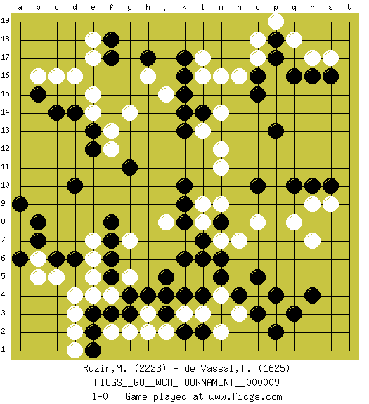Last move : 1-0 2013 February 4 19:0:10 [Event "FICGS__GO__WCH_TOURNAMENT__000009"] [Site "FICGS"] [Date "2012.11.01"] [Round "1"] [Black "Ruzin,Mikhail"] [White "de Vassal,Thibault"] [Result "1-0"] [Rating 1 "2223"] [Rating 2 "1625"] 1.q16 d4 2.r4 d16 3.o3 p3 4.p4 o4 5.q3 n3 6.p2 m4 7.o5 q8 8.q10 o8 9.o10 n7 10.n4 l3 11.m5 l5 12.m6 l8 13.l6 k5 14.k6 j8 15.m8 m7 16.l7 m9 17.k8 l9 18.k9 m12 19.k10 m11 20.k13 m14 21.p13 m16 22.k16 o17 23.p17 o18 24.o16 n16 25.o15 l16 26.k17 l17 27.l14 l13 28.k14 r9 29.r10 r7 30.j5 h3 31.k4 k3 32.j3 j2 33.j4 g2 34.l4 g5 35.c14 c16 36.f17 e17 37.f18 e18 38.c6 c5 39.d6 b5 40.d10 a8 41.b15 b16 42.b7 a7 43.a6 b6 44.b8 e14 45.d14 e15 46.e13 g7 47.g4 f4 48.f5 e5 49.f6 e6 50.f7 e7 51.f8 g14 52.f3 e4 53.g3 f2 54.e3 d3 55.e2 d2 56.e1 d1 57.h4 h2 58.l2 m2 59.k2 j15 60.k15 h16 61.h17 f13 62.e12 f12 63.g11 q18 64.p18 p19 65.a9 r17 66.r16 s17 67.s16 s9 68.s10 1-0 Here are the names of the openings (joseki) played in the four corners : Corner q16 : q16 m12 Hoshi (Hwajeom, Seongjeom, Xingwei`) 4-4 Point. The star or hoshi (4-4) point, emphasizing influence at the potential expense of territory. Corner d16 : d16 c14 Hoshi (Hwajeom, Seongjeom, Xingwei`) 4-4 Point. The star or hoshi (4-4) point, emphasizing influence at the potential expense of territory. Ikken Kakari (Hankan Keolch'im, Yi Gua`jiao~, 1-Space Low Approach). Black 2 is the standard approach move to the 4-4. Player Black won this Go (weiqi, baduk) game. Follow this game move after move (download)If you lose by one point, take a rest. (Anonymous) Tomorrow's what you make of it. (Horatio Caine, C.S.I. Miami)