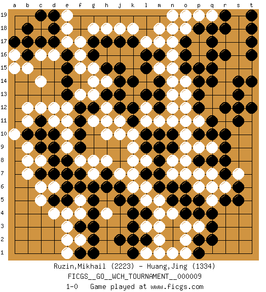 Last move : 1-0 2013 June 20 9:17:41 [Event "FICGS__GO__WCH_TOURNAMENT__000009"] [Site "FICGS"] [Date "2012.11.01"] [Round "1"] [Black "Ruzin,Mikhail"] [White "Huang,Jing"] [Result "1-0"] [Rating 1 "2223"] [Rating 2 "1334"] 1.q16 d4 2.q3 d16 3.r9 n4 4.k4 q5 5.p5 p6 6.p4 q7 7.o6 o7 8.n6 n7 9.m6 l5 10.l4 m5 11.n5 m4 12.k5 l6 13.m7 k6 14.j6 j7 15.h6 k8 16.l7 k7 17.m9 p9 18.q10 o11 19.p10 o10 20.p8 o8 21.q8 p7 22.r7 r6 23.l10 h4 24.j5 g8 25.f6 f4 26.h7 h8 27.e8 e10 28.e5 e4 29.f9 j10 30.f10 e11 31.f11 e12 32.j12 h12 33.h11 j11 34.k12 g11 35.g12 h10 36.h13 l3 37.k3 m2 38.l2 m3 39.j2 o3 40.p2 o2 41.q4 k9 42.r5 s7 43.r8 q6 44.s5 m11 45.n9 o9 46.s6 l11 47.k11 k10 48.l9 h11 49.j13 n14 50.p13 g13 51.f12 f13 52.e13 f15 53.m13 n13 54.m12 n12 55.l15 m15 56.l16 p17 57.o16 n17 58.o17 l14 59.k14 l17 60.k17 o18 61.p18 m18 62.m16 n16 63.o15 n15 64.o19 n18 65.q18 k18 66.j17 j18 67.h17 h18 68.g17 g18 69.e14 g15 70.e15 f16 71.j15 c12 72.e16 f17 73.d17 c16 74.c17 c14 75.b16 b15 76.b18 a16 77.b17 e18 78.d18 e17 79.c19 c6 80.g3 f2 81.g4 e7 82.f7 f8 83.d7 e9 84.d8 d6 85.e6 b8 86.c9 b9 87.d5 c5 88.c11 b12 89.f3 e2 90.d10 d12 91.c7 b7 92.g2 e3 93.p12 l1 94.k2 g7 95.g6 r17 96.q17 s15 97.r16 s16 98.m14 s18 99.r18 s17 100.s14 s19 101.t18 r14 102.s13 r13 103.r12 s12 104.s11 o14 105.p14 r15 106.q15 q12 107.t12 r11 108.s12 p11 109.q11 q13 110.r19 t15 111.t17 p19 112.b10 b11 113.k1 q9 114.r10 p3 115.q2 l12 116.l13 a10 117.c10 h14 118.h15 e19 119.a17 a15 120.m1 n1 121.f1 e1 122.g1 f5 123.g5 n19 124.t19 o12 125.g16 l8 126.m8 m17 127.p1 l1 128.m10 n11 129.m1 g14 130.j14 l1 131.o4 m1 132.n10 o19 133.q14 p16 134.p15 o13 135.t14 q19 136.t16 n8 137.o5 c8 138.d9 d11 139.e7 o1 140.d19 pass 141.pass pass 142.pass 1-0 Comment by player 2 : Jing Huang : Oh... do I have to resign to end the game? Here are the names of the openings (joseki) played in the four corners : Corner d4 : d4 j6 Hoshi (Hwajeom, Seongjeom, Xingwei`) 4-4 Point. The star or hoshi (4-4) point, emphasizing influence at the potential expense of territory. Corner q16 : q16 o11 Hoshi (Hwajeom, Seongjeom, Xingwei`) 4-4 Point. The star or hoshi (4-4) point, emphasizing influence at the potential expense of territory. Player Black won this Go (weiqi, baduk) game. Follow this game move after move (download)White is always trying to kill a bigger group than black is trying to save. (Anonymous) There will be no order, only chaos. (Sol Robeson in Pi by Darren Aronofsky)