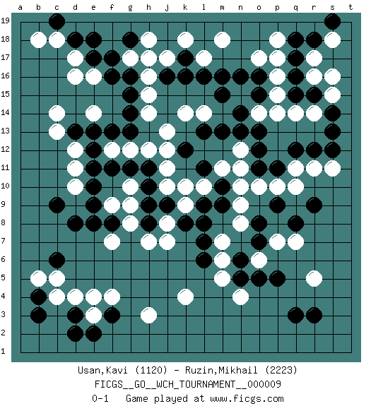 Last move : 0-1 2013 January 10 14:40:56 [Event "FICGS__GO__WCH_TOURNAMENT__000009"] [Site "FICGS"] [Date "2012.11.01"] [Round "1"] [Black "Usan,Kavi"] [White "Ruzin,Mikhail"] [Result "0-1"] [Rating 1 "1120"] [Rating 2 "2223"] 1.q16 d16 2.q3 d4 3.r9 n4 4.p5 k4 5.f17 c14 6.j16 d10 7.m16 r14 8.r15 q14 9.o15 q11 10.p9 o14 11.f3 h3 12.d2 e3 13.e2 f4 14.d3 e4 15.b4 c4 16.b3 b5 17.d8 f9 18.c6 c5 19.f8 g8 20.e9 f7 21.e8 g9 22.e10 d11 23.e11 d12 24.g11 j10 25.h10 j11 26.h9 j8 27.h8 h7 28.j9 k9 29.k8 j7 30.l9 k10 31.l8 j13 32.g13 h14 33.g14 h16 34.g15 h15 35.g16 j17 36.k16 g17 37.g18 h17 38.e17 e16 39.f16 d17 40.d18 c18 41.e18 h18 42.c19 b18 43.c9 f12 44.e12 g12 45.f13 g10 46.d13 c13 47.h11 h12 48.f11 e14 49.e13 l14 50.n14 n15 51.m15 p15 52.o16 p16 53.o13 p14 54.q17 o17 55.n16 p17 56.m13 n12 57.n13 m11 58.l13 k14 59.k12 j12 60.l11 l10 61.m10 n10 62.m9 l17 63.k17 k18 64.l16 m18 65.o11 r5 66.r3 q7 67.q8 p7 68.n6 n11 69.o12 o6 70.o5 n9 71.o8 n8 72.l6 m7 73.l7 m6 74.n5 m5 75.o7 o10 76.q12 r11 77.r12 p10 78.p11 q10 79.s12 s11 80.s14 s15 81.s13 r16 82.q15 r17 83.q18 s16 84.r18 s18 85.s19 p18 0-1 Here are the names of the openings (joseki) played in the four corners : Corner d16 : d16 f17 Hoshi (Hwajeom, Seongjeom, Xingwei`) 4-4 Point. The star or hoshi (4-4) point, emphasizing influence at the potential expense of territory. Ikken Kakari (Hankan Keolch'im, Yi Gua`jiao~, 1-Space Low Approach). Black 2 is the standard approach move to the 4-4. Corner d4 : d4 f3 Hoshi (Hwajeom, Seongjeom, Xingwei`) 4-4 Point. The star or hoshi (4-4) point, emphasizing influence at the potential expense of territory. Ikken Kakari (Hankan Keolch'im, Yi Gua`jiao~, 1-Space Low Approach). Black 2 is the standard approach move to the 4-4. Player White won this Go (weiqi, baduk) game. Follow this game move after move (download)A knight's move near the edge of the board cannot be cut. (Bill Taylor) If you don't practice you don't deserve to win. (Andre Agassi)