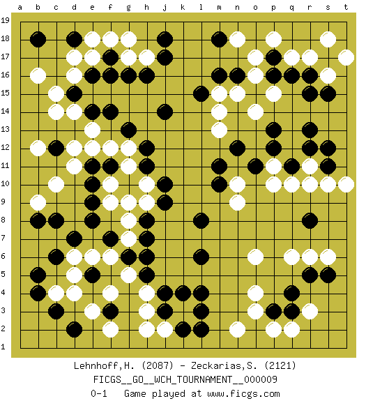 Last move : 0-1 2013 April 16 1:6:17 [Event "FICGS__GO__WCH_TOURNAMENT__000009"] [Site "FICGS"] [Date "2012.12.09"] [Round "1"] [Black "Lehnhoff,Heinz-Georg"] [White "Zeckarias,Simon"] [Result "0-1"] [Rating 1 "2087"] [Rating 2 "2121"] 1.q16 d4 2.q4 d16 3.f17 c14 4.d18 g17 5.g16 h17 6.h16 f18 7.j17 e17 8.f16 e18 9.m16 r10 10.f3 d6 11.d2 r6 12.r5 q6 13.r13 o3 14.p3 o4 15.s11 r11 16.c8 h3 17.c3 c10 18.e8 f4 19.f7 e3 20.b5 r3 21.s5 p2 22.l4 o6 23.r12 s10 24.e10 r17 25.r16 q17 26.l6 f2 27.p17 p18 28.l8 o17 29.p16 o16 30.b18 b16 31.e16 d17 32.s17 n18 33.m18 s18 34.c12 d12 35.h5 k3 36.l3 b12 37.k2 j2 38.l2 n2 39.e5 g5 40.j4 e6 41.c6 c4 42.b4 h4 43.g6 f6 44.h7 e13 45.g13 g12 46.h12 f12 47.h11 n9 48.q11 q10 49.d7 d5 50.m10 n10 51.k4 s16 52.s15 t17 53.j18 o14 54.p12 g8 55.n12 g7 56.h6 f10 57.e11 d11 58.f11 g11 59.g10 f9 60.e9 h10 61.j10 h9 62.j9 p15 63.r15 m15 64.j14 m13 65.m11 b9 66.d15 c15 67.f14 d14 68.l15 m14 69.b8 p11 70.p13 g18 71.h8 g9 72.r8 s6 73.q3 q2 74.n16 n15 75.s12 t10 76.o11 p10 77.j3 h2 78.e14 e12 0-1 Here are the names of the openings (joseki) played in the four corners : Corner d16 : d16 f17 Hoshi (Hwajeom, Seongjeom, Xingwei`) 4-4 Point. The star or hoshi (4-4) point, emphasizing influence at the potential expense of territory. Ikken Kakari (Hankan Keolch'im, Yi Gua`jiao~, 1-Space Low Approach). Black 2 is the standard approach move to the 4-4. Corner d4 : d4 f3 Hoshi (Hwajeom, Seongjeom, Xingwei`) 4-4 Point. The star or hoshi (4-4) point, emphasizing influence at the potential expense of territory. Ikken Kakari (Hankan Keolch'im, Yi Gua`jiao~, 1-Space Low Approach). Black 2 is the standard approach move to the 4-4. Corner q4 : q4 r6 Hoshi (Hwajeom, Seongjeom, Xingwei`) 4-4 Point. The star or hoshi (4-4) point, emphasizing influence at the potential expense of territory. Ikken Kakari (Hankan Keolch'im, Yi Gua`jiao~, 1-Space Low Approach). White 2 is the standard approach move to the 4-4. Player White won this Go (weiqi, baduk) game. Follow this game move after move (download)Play slow, win slow; play fast, lose fast. (Anonymous) The real danger is not that computers will begin to think like men, but that men will begin to think like computers. (Sydney J. Harris)