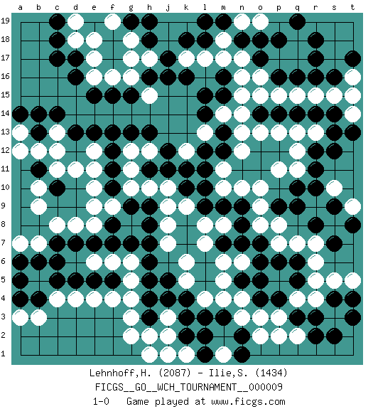 Last move : 1-0 2013 October 25 19:46:21 [Event "FICGS__GO__WCH_TOURNAMENT__000009"] [Site "FICGS"] [Date "2012.11.01"] [Round "1"] [Black "Lehnhoff,Heinz-Georg"] [White "Ilie,Sebastian"] [Result "1-0"] [Rating 1 "2087"] [Rating 2 "1434"] 1.q16 r4 2.d16 d4 3.p4 n3 4.r3 q4 5.q3 p3 6.s4 s3 7.s2 p5 8.o4 s5 9.t3 o3 10.n5 r6 11.m3 n4 12.o5 m5 13.q5 r5 14.p6 m4 15.r8 q7 16.p9 p7 17.o7 o8 18.n7 p8 19.q9 m8 20.m7 l7 21.q6 r7 22.n8 o9 23.n9 o10 24.r12 n10 25.c6 f4 26.j5 m6 27.m9 l8 28.l9 o13 29.l11 n6 30.o6 j8 31.m12 q13 32.s14 q11 33.r11 r13 34.s13 r15 35.q10 p11 36.o14 n13 37.m15 m14 38.l14 n15 39.r16 s15 40.r14 q15 41.q14 p15 42.p14 n14 43.l15 o15 44.o17 n17 45.n18 m17 46.l18 m18 47.s16 t14 48.t13 t15 49.o18 l17 50.h6 k9 51.k10 j10 52.j11 p13 53.s12 s10 54.r10 s8 55.s9 t9 56.s7 r9 57.h3 g3 58.s9 q2 59.r2 p2 60.t8 h2 61.b4 c8 62.g7 h10 63.h11 f9 64.e7 e8 65.d7 b7 66.k4 j2 67.c10 d8 68.l3 f6 69.f7 b5 70.c5 c4 71.d13 d18 72.b6 b3 73.a5 g6 74.h7 k6 75.h4 j3 76.g9 g10 77.h9 j9 78.f10 e10 79.f11 g11 80.f12 k5 81.j4 k12 82.k11 g12 83.h13 d11 84.g13 c11 85.b11 b12 86.b13 b10 87.c17 e16 88.n2 l4 89.k3 j7 90.k2 m1 91.l1 a3 92.e5 e6 93.d5 g4 94.a4 a7 95.a6 e4 96.e15 f16 97.h16 h17 98.j17 g17 99.k18 o16 100.h18 g18 101.k16 p17 102.p18 q17 103.p16 q18 104.r18 l13 105.g19 f19 106.h19 e18 107.m13 m11 108.l12 n12 109.r17 m10 110.l10 q12 111.d17 e17 112.c18 d19 113.f15 g16 114.j1 g2 115.g15 c13 116.c14 c12 117.b14 h12 118.j12 h15 119.j16 e12 120.e13 e11 121.f13 t16 122.t17 t5 123.t4 h1 124.c19 n19 125.c7 b9 126.f8 e9 127.m16 o19 128.q19 n16 129.h8 k1 130.l2 j1 131.l19 k17 132.m19 o2 133.f5 g5 134.h5 a13 135.a14 a12 136.n1 1-0 Here are the names of the openings (joseki) played in the four corners : Corner q4 : r4 p4 Komoku (Somok, Xiao~mu`) 3-4 Point. The komoku (3-4) point is the traditional corner enclosure move.. Ikken Takagakari (Hankan Nop'dakeolch'im, Yi Gaogua`jiao~, 1-Space High Approach). The 5-4 approach move has become more popular in modern times, as modern Go emphasizes speed and influence. Corner d4 : d4 c6 Hoshi (Hwajeom, Seongjeom, Xingwei`) 4-4 Point. The star or hoshi (4-4) point, emphasizing influence at the potential expense of territory. Ikken Kakari (Hankan Keolch'im, Yi Gua`jiao~, 1-Space Low Approach). Black 2 is the standard approach move to the 4-4. Player Black won this Go (weiqi, baduk) game. Follow this game move after move (download)In opponents' sphere of influence, avoid sharp conflict, don't move too deep. (Otake Hideo, 9p) All politicians must be presumed guilty until they are proven innocent. (Dinesh De Silva)